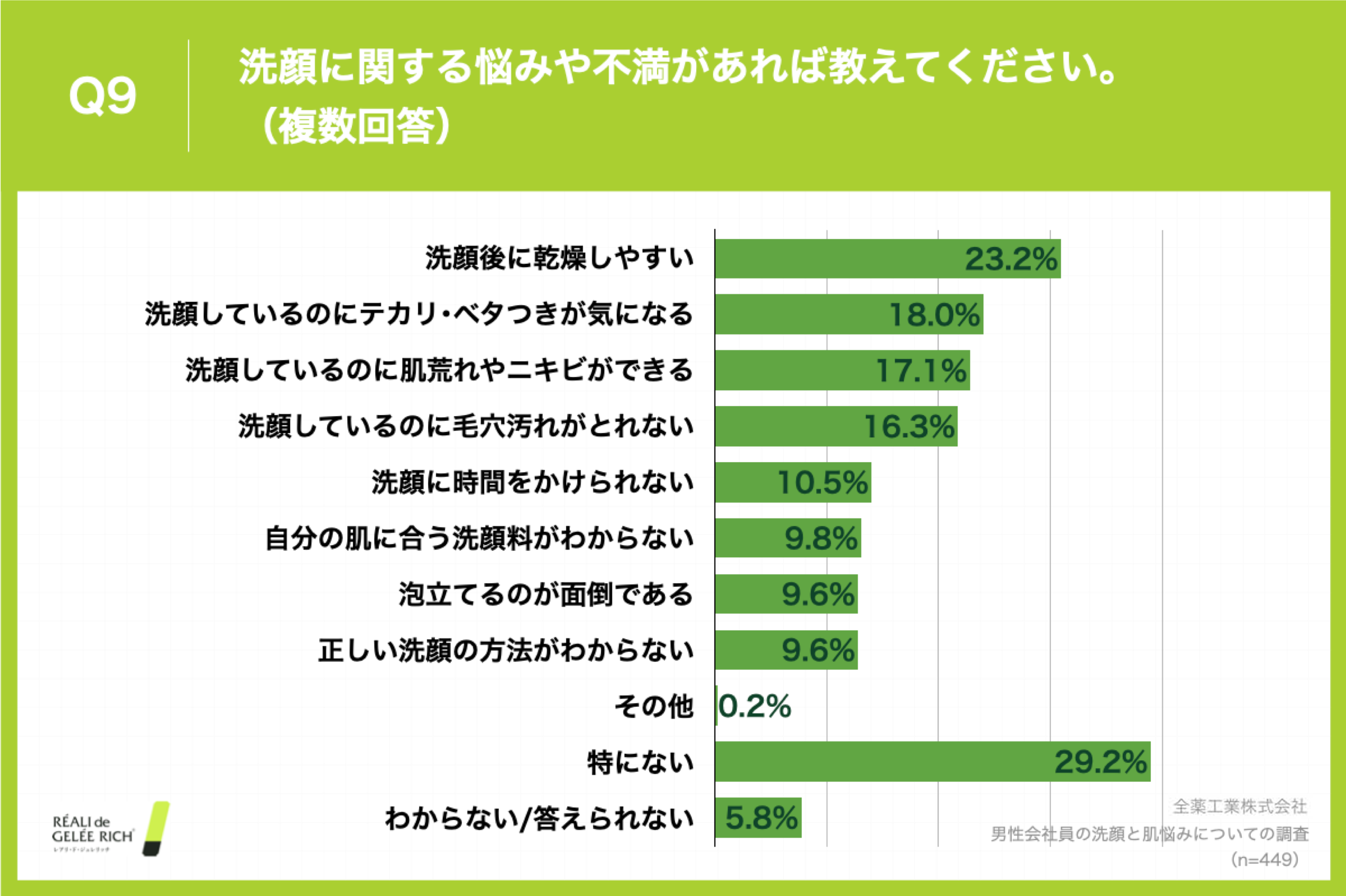 Q9. 「洗顔に関する悩みや不満があれば教えてください。(複数回答)」と質問したところ、「洗顔後に乾燥しやすい」が23.2%、「洗顔しているのにテカリ・ベタつきが気になる」が18.0%という回答となりました。(n=449)