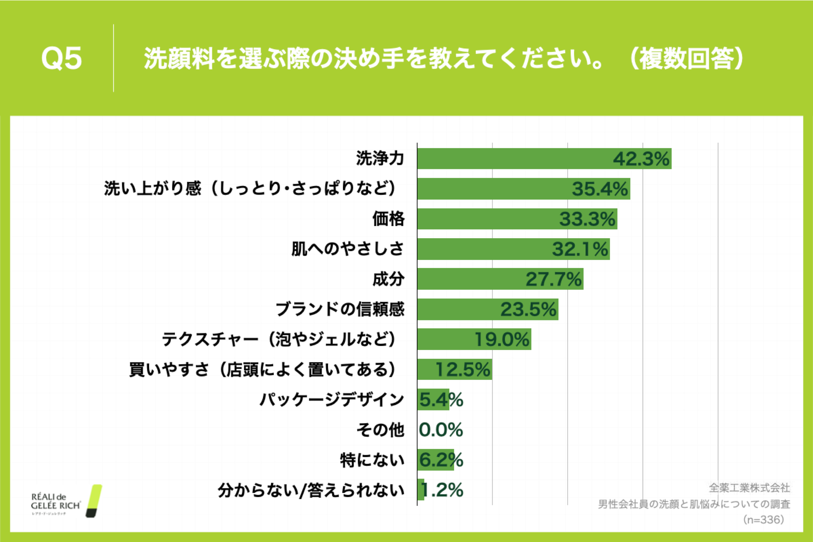 Q5. 「洗顔料を選ぶ際の決め手を教えてください。(複数回答)」と質問したところ、「洗浄力」が42.3%、「洗い上がり感(しっとり・さっぱりなど)」が35.4%、「価格」が33.3%という回答となりました。(n=336)