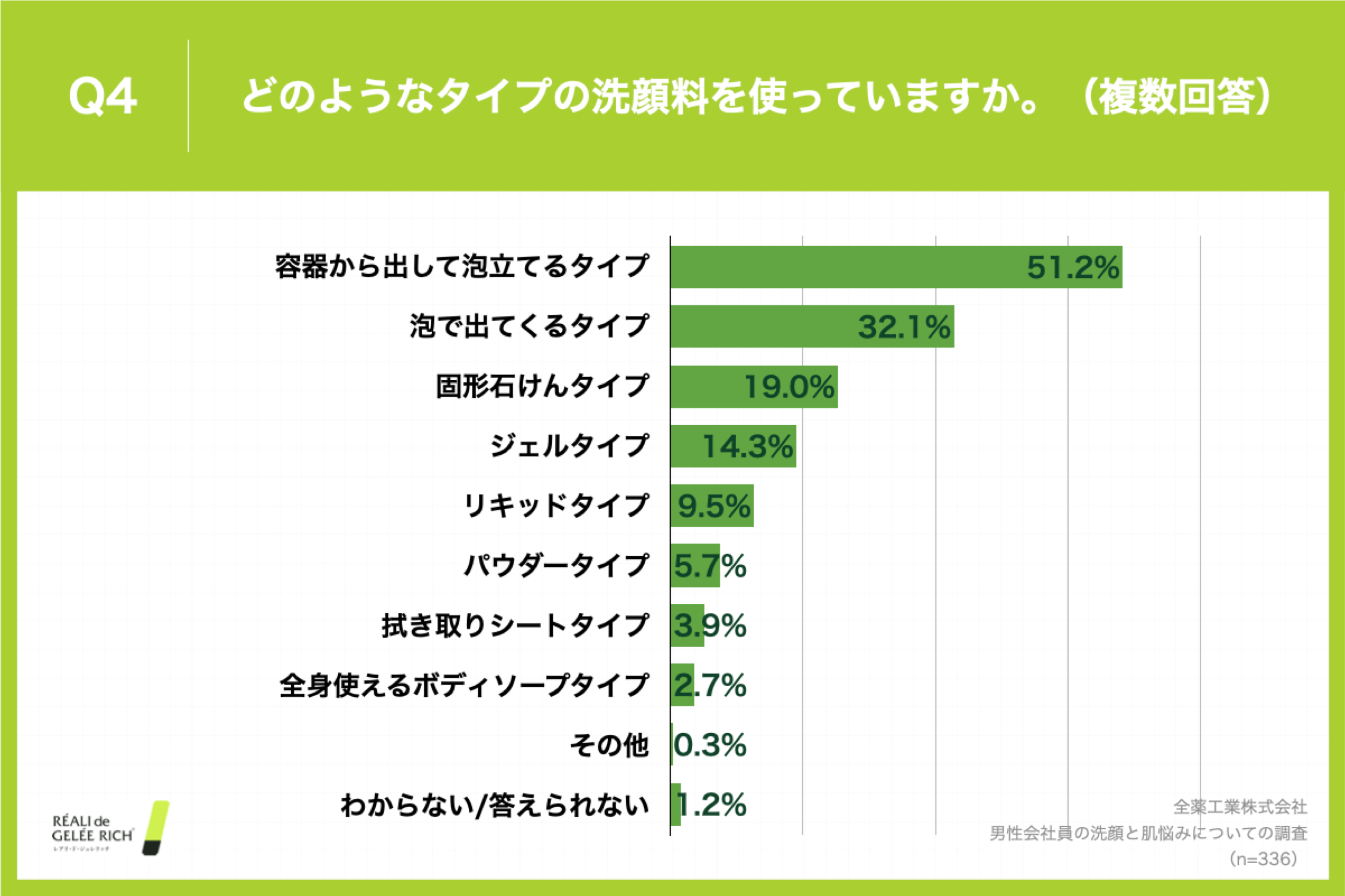 Q4. 「どのようなタイプの洗顔料を使っていますか。(複数回答)」と質問したところ、「容器から出して泡立てるタイプ」が51.2%、「泡で出てくるタイプ」が32.1%、「固形石けんタイプ」が19.0%という回答となりました。(n=336)
