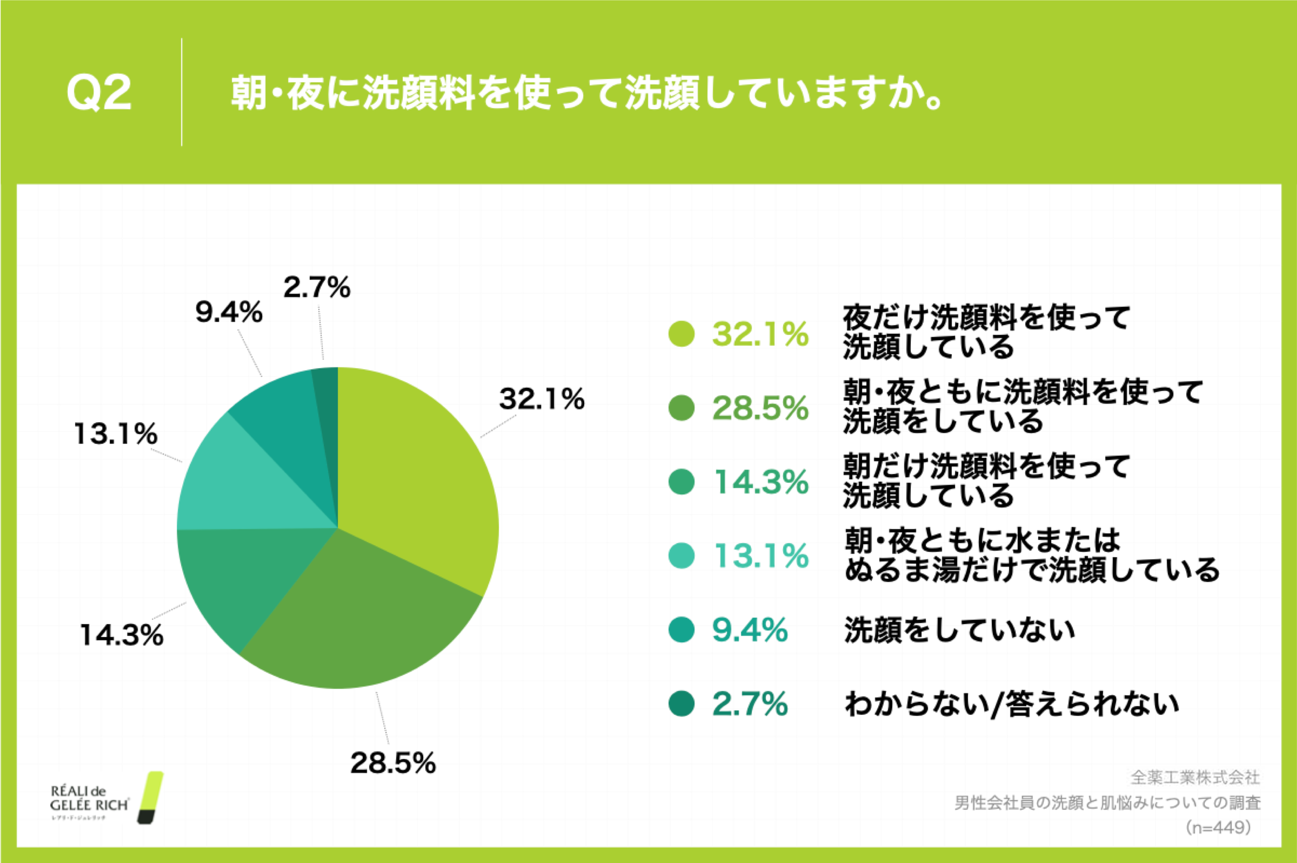 Q2. 「朝・夜に洗顔料を使って洗顔していますか。」と質問したところ「夜だけ洗顔料を使って洗顔している」が32.1%と最も多い結果となりました。 次いで「朝・夜ともに洗顔料を使って洗顔をしている」は28.5%、「朝だけ洗顔料を使って洗顔している」が14.3%となり、朝・夜どちらか(あるいはどちらも)洗顔の際に洗顔料を使用している回答の合計は全体の74.9%となりました。(n=449)