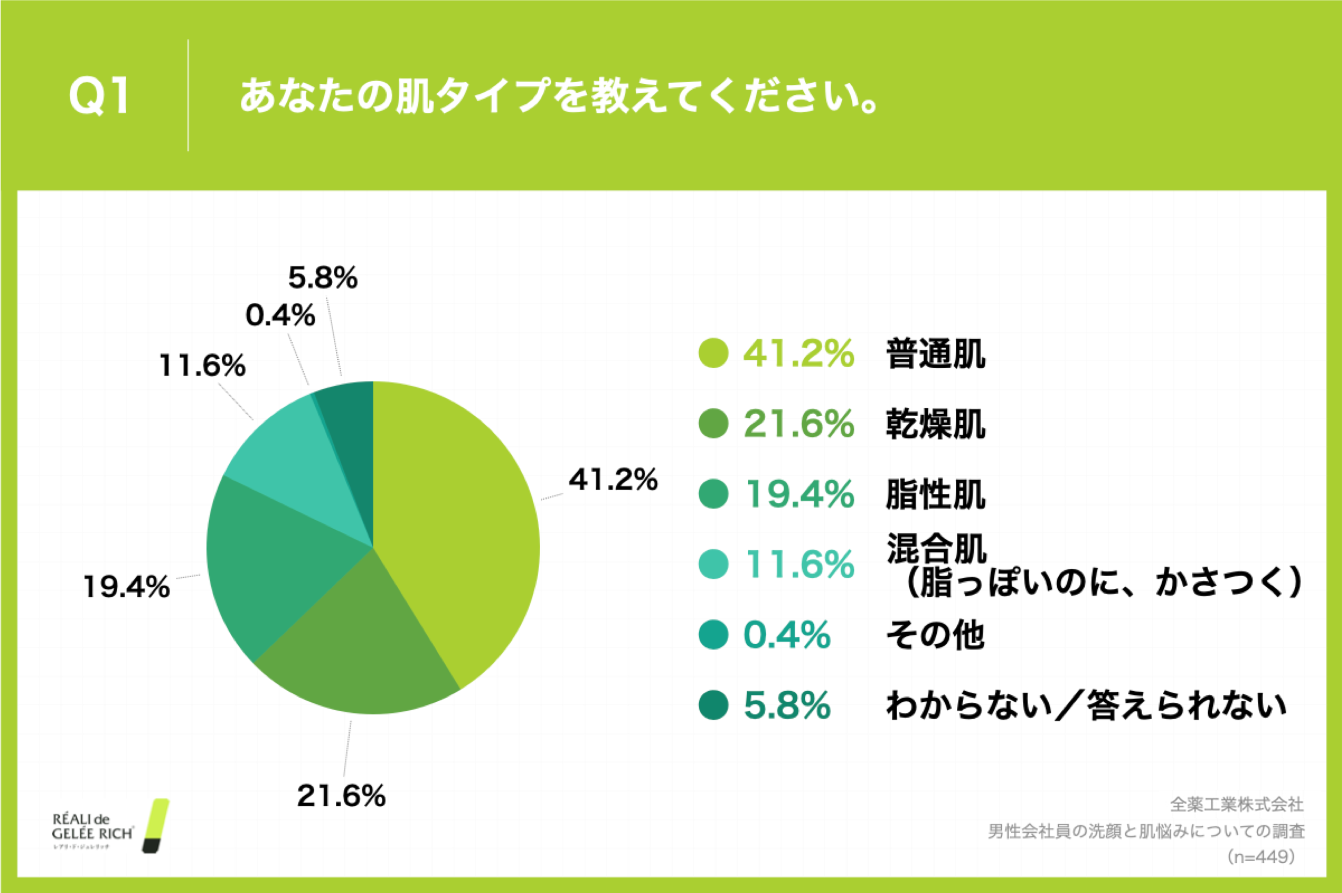 Q1.「あなたの肌タイプを教えてください。」と質問したところ、「普通肌」が41.2%という回答があった一方で、「乾燥肌」が21.6%、「脂性肌」が19.4%、混合肌が11.6%と、「普通肌」以外の回答が半数以上(52.6%)となりました。(n=449)