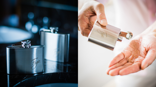 化粧水・美容液は目に入るとつい手にとりたくなるスキットルデザイン。