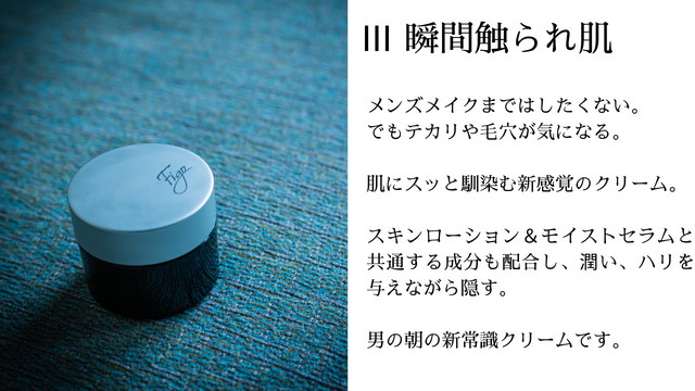 ミドル世代の男性の肌によくみられる「テカリ」「脂っぽさ」を抑え、きめ細やかでハリのある肌へと導き、つい触れさせたくなるモテ肌を目指して誕生しました。