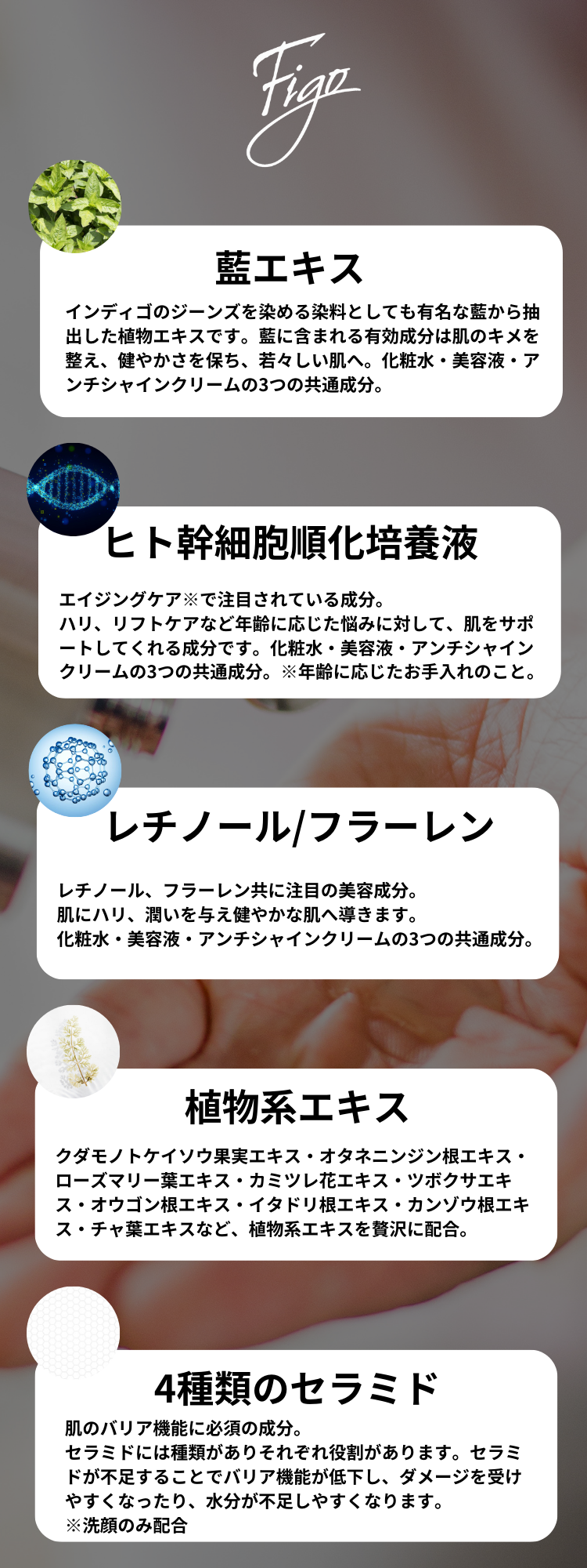 ハリ、リフトケアなど年齢に応じた悩みに対して、肌をサポートしてくれる成分です。化粧水・美容液・アンチシャインクリームの3つの共通成分。