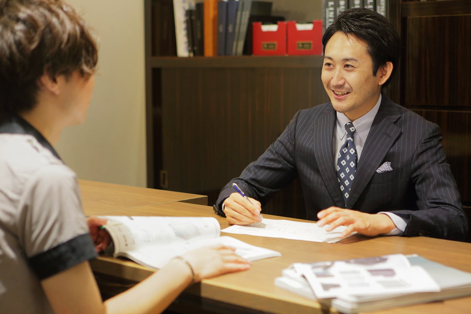 お手持ちのスーツやジャケットとのコーディネートを、ライフシーンに合わせてスタッフがご提案します。オーダーシャツのサンプルも用意していますので、イメージを共有しながら生地のセレクトからデザイン決めまでサポートいたします。初めての方でも安心です。
