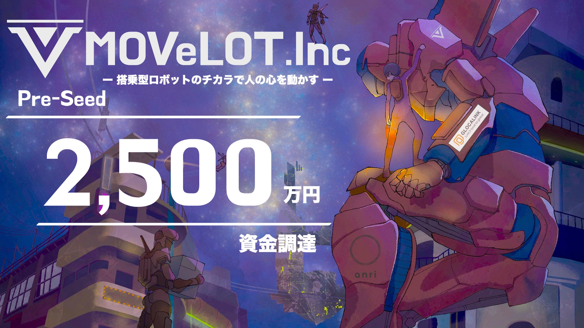MOVeLOT.Inc (本社所在地:東京都墨田区 代表取締役:廣井 健人) は、プレシードラウンドにおいて、ANRIおよび株式会社グローカリンクを引受先としたJ-KISS型新型予約権の発行による総額2,500万円の資金調達を行ったことをお知らせいたします。本ラウンドの資金調達によって、組織形成と搭乗型ロボット市場の拡張を進めていきます。