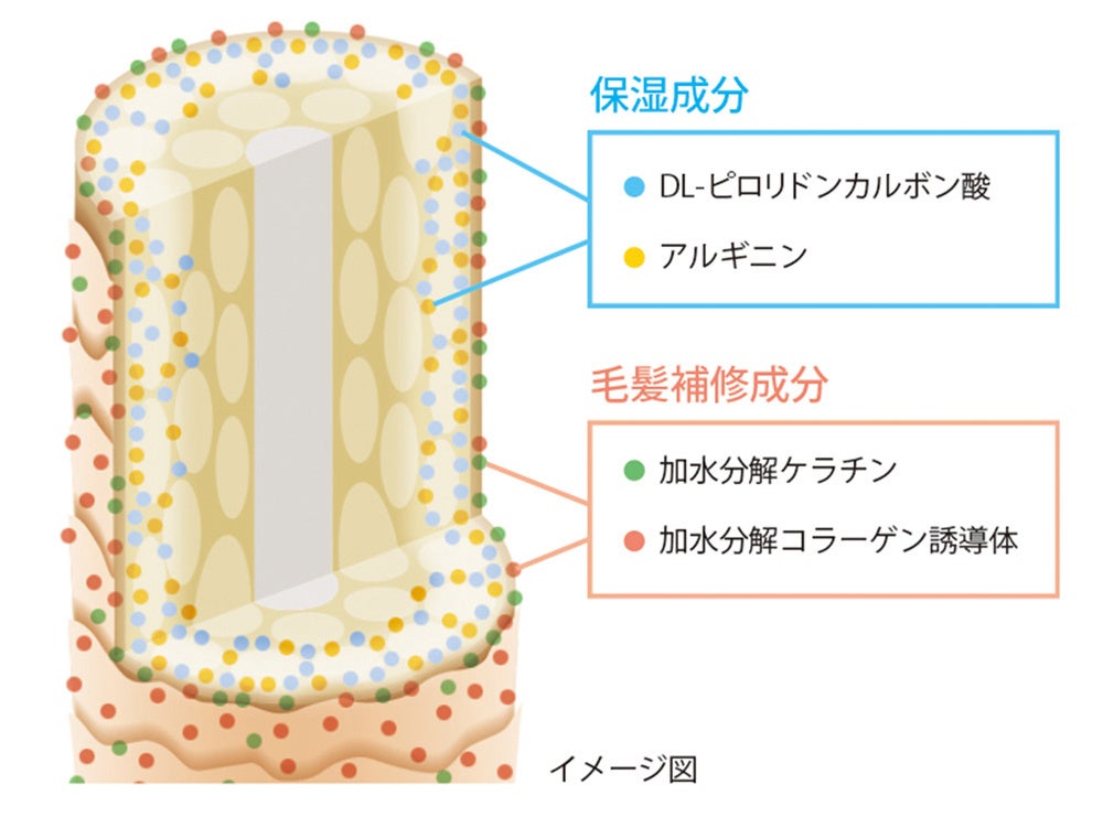 保湿成分が内部へ浸透し、髪に潤いとなめらかさを与え、毛髪補修成分は髪表面に吸着し、キューティクルを整えてハリ・コシをサポートします。