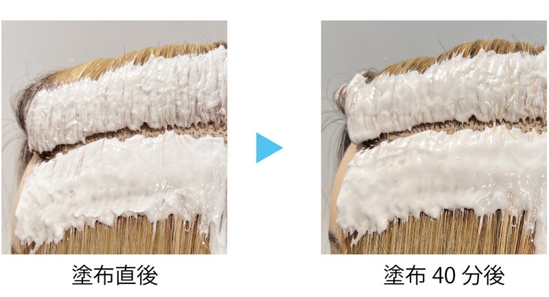 薬液は滑らかなクリーム状で仕上がりの明度に影響する塗布量が調整しやすい(髪にたっぷり塗布できる)。またスムーズに伸び、塗布後は垂れのない薬液粘性を実現。