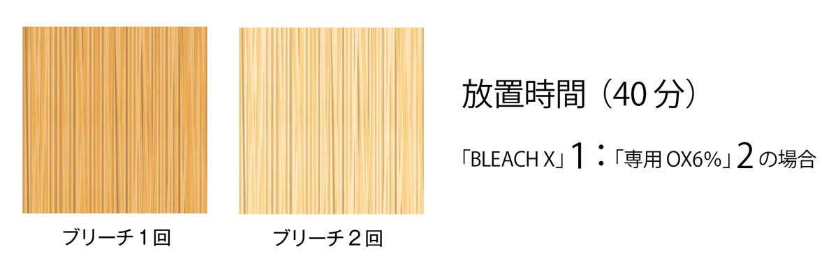 「BLEACH X®(ブリーチエックス)」は優れた脱色効果を持ち、デザインカラーやハイトーンカラーを作る上でベースとなる髪色をまっさらなキャンバスの様にムラなくリフトアップさせて仕上げることができます。塗布後10分で10LVまで上がり、その後緩やかにリフトアップするので狙った明るさを表現できます。また、髪に留まりやすく垂れにくい薬液特性は使いやすく操作性に優れています。