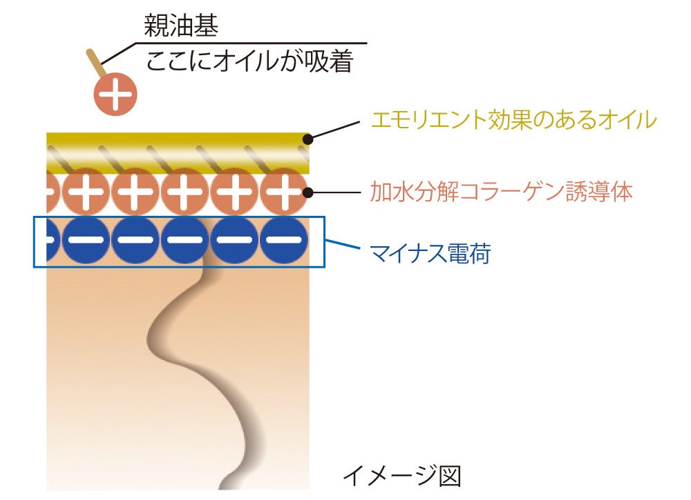 髪の表面に帯びたマイナス電荷に「BLEACH X」配合の「加水分解コラーゲン誘導体※」が吸着することで、エモリエント効果のあるオイルの吸着を促進させて薬剤塗布の際の刷毛による毛髪への負担を軽減します。