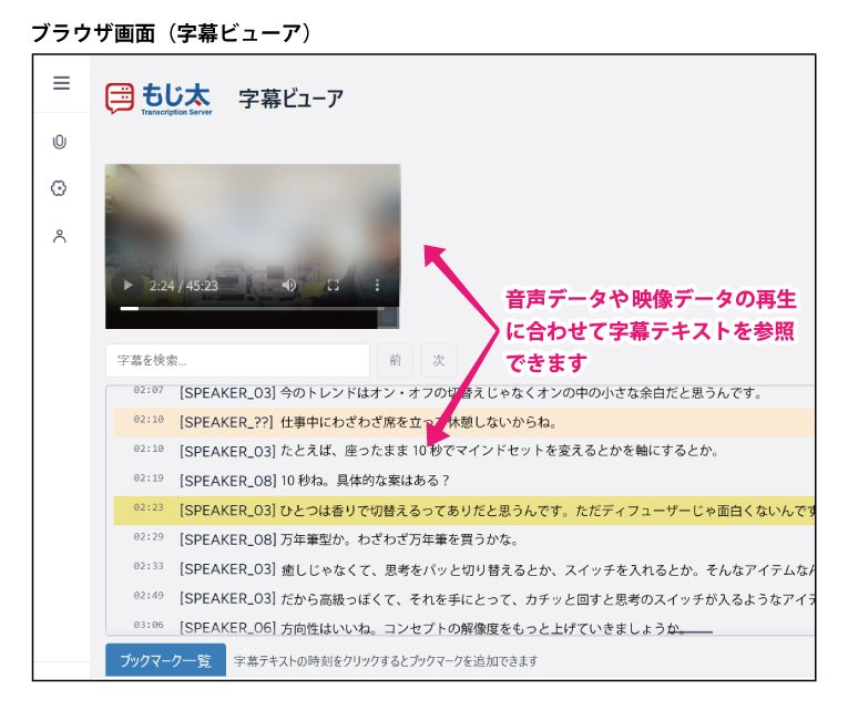 ・文字起こしされた字幕テキストを音声データ、映像データと同期しながら確認できます。