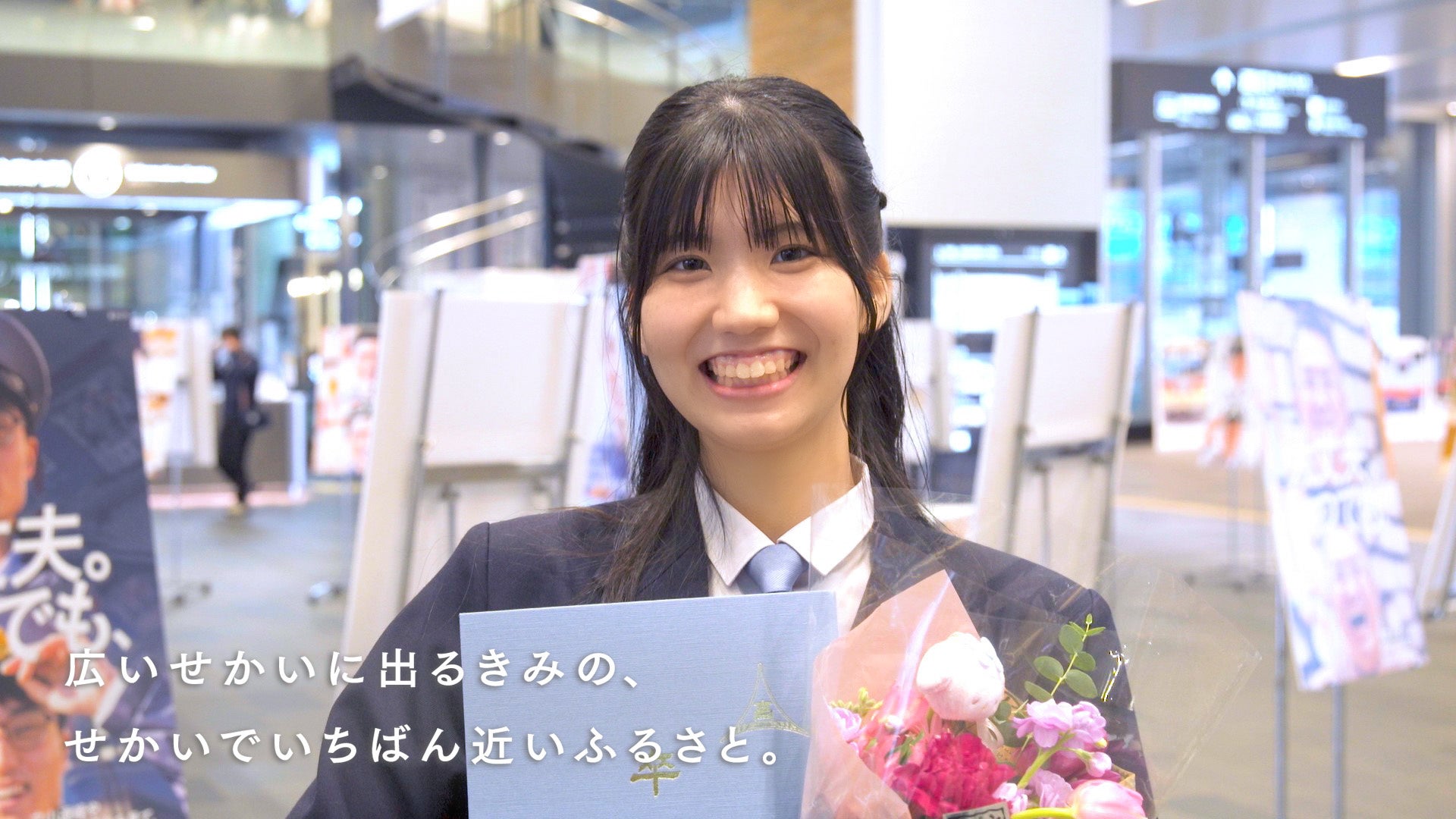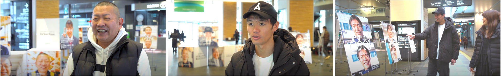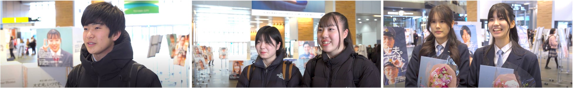 プロジェクトムービーは、駅を行き交う人たちが展示を眺めている様子や、卒業式帰りの高校生たちが展示を見た感想を語っているインタビューが収録されています。また、スナップ動画に出演している2名が登場し、「少しでも県外に旅立つ若者の力になりたい」と今回の企画にご協力いただいた胸の内を語っていただいています。