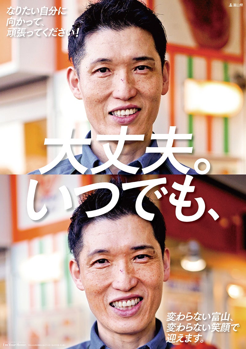 今回の企画趣旨が詰まったコピーのテロップがストリートスナップの上に載せられていった後、街の人たちの「いってらっしゃい」と卒業する高校生の「いってきます」のカットが入り、最後には立山連峰を背景に富山県のロゴが映し出されます。