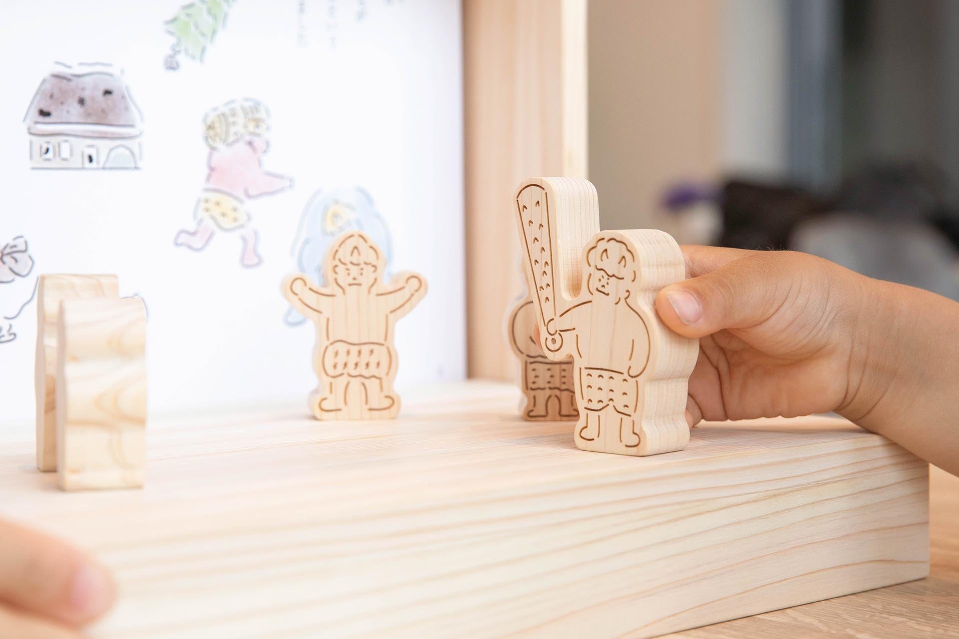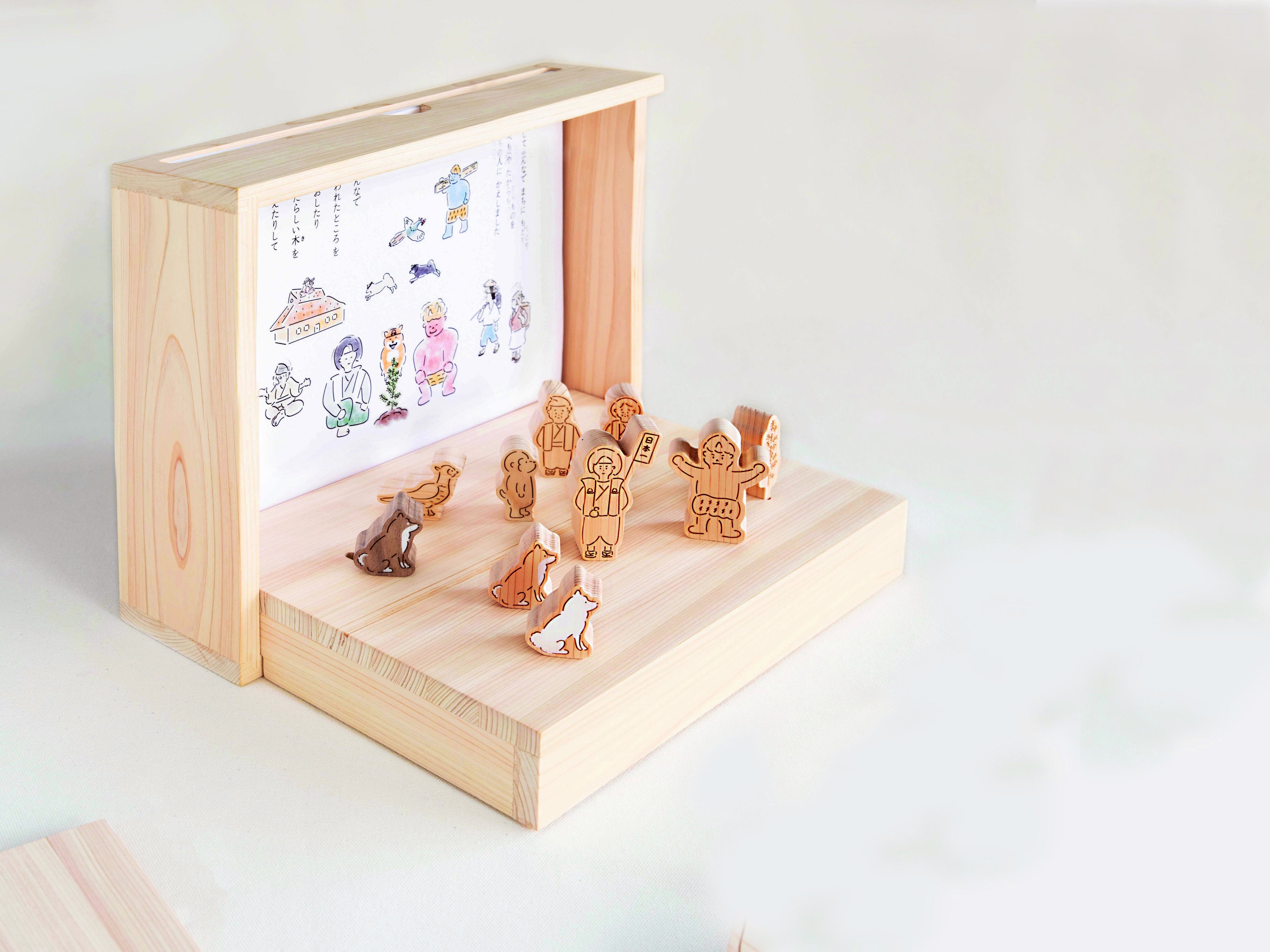 紙芝居とキャラクター積み木の組み合わせならではの、懐かしくも新しい体験型の木育絵本になっています。