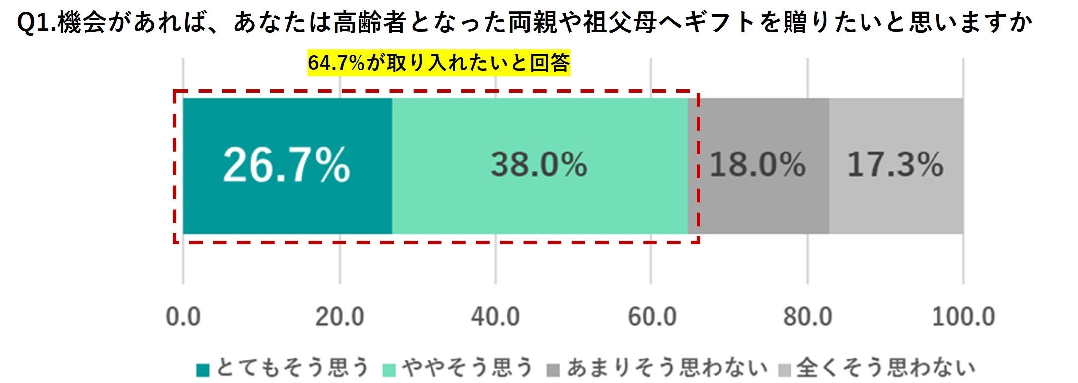 「高齢者となった両親や祖父母へギフトを贈りたいかどうか、という質問に対して「贈りたい(とてもそう思う・ややそう思うと回答した人)」と回答した人は64.7%にものぼり、過半数の人が「ギフトを贈りたい」と考えていることがわかりました。