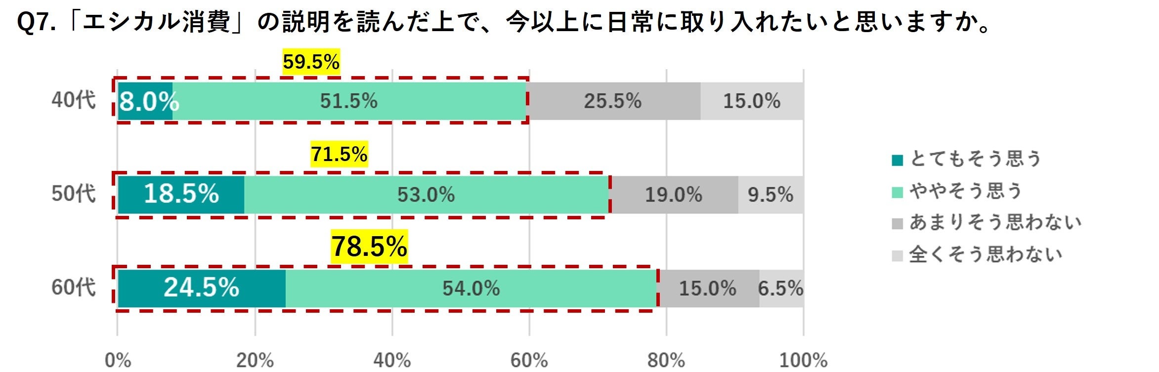 「エシカル消費を今以上に日常に取り入れたいか」という質問について、「そう思う(とてもそう思う・ややそう思う)」と回答した人の割合は、年代が上がるごとに増える結果となりました。具体的には、「40代(59.5%)」 、「50代(71.5%)」 、 「60代(78.5%)」と並び、60代はエシカル消費に対して前向きな姿勢であることが伺えます。