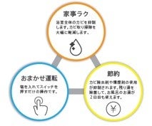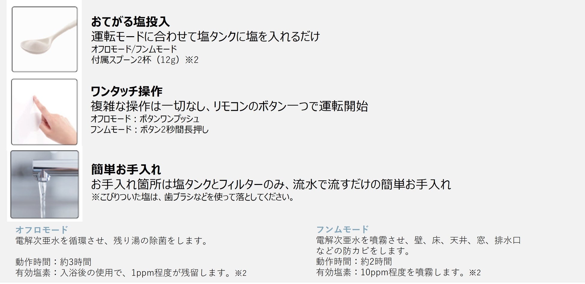 塩タンクに塩を入れて、残り湯に「JOKER」を浮かべます。スイッチ一つで残り湯を電気分解し、生成した次亜塩素酸によって残り湯と浴室をまるごと除菌します。今まで使用していた洗浄剤や燻煙材が不要になり、この1台でお風呂掃除の悩みを1台で解決します。