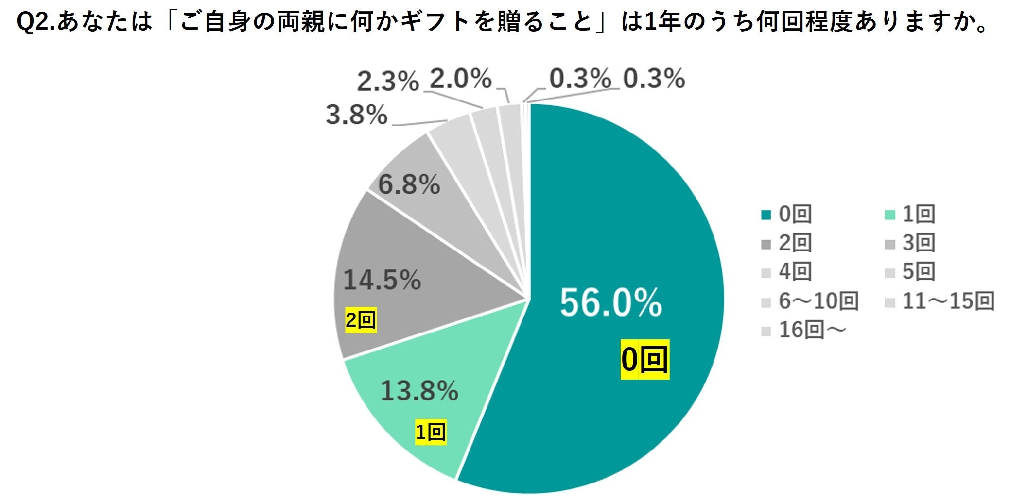 - ① 「両親や祖父母にギフトを贈りたい」と思っている人は約7割。一方で、2人に1人は実際にギフトを贈る回数が「0回」だった!?
