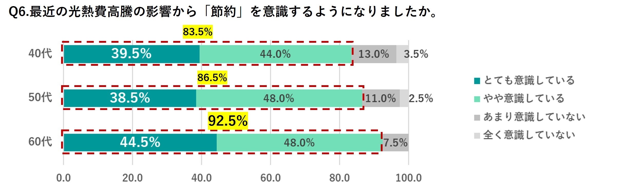 最近の光熱費高騰の影響によって「節約」を意識するようになった人(「とても意識している」「やや意識している」)の内訳を見ていくと、60代(92.5%)が最も高く、次いで、50代(86.5%)、40代(83.5%)という結果となりました。