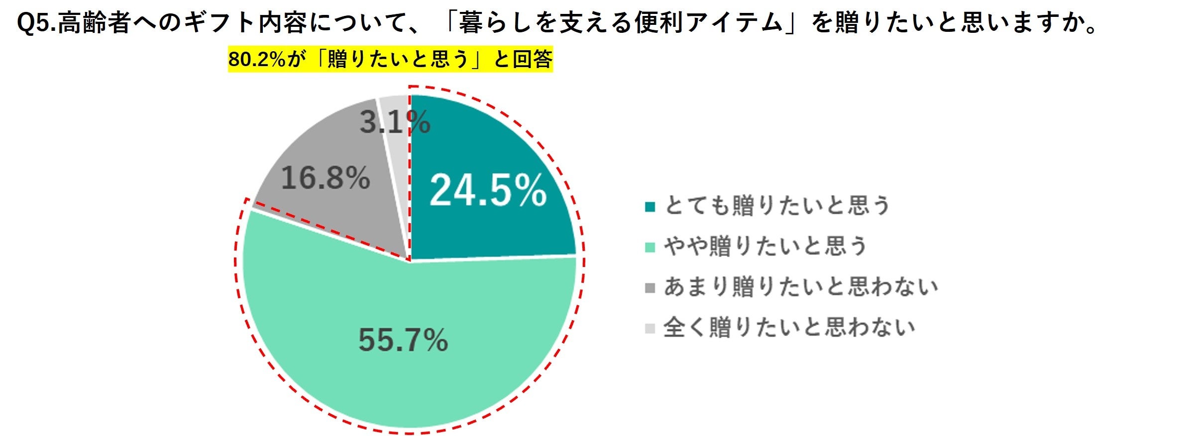 「贈りたいギフト内容」について、「暮らしを支える便利アイテム」を贈りたいと答えた人が8割を超える結果となりました。核家族化が進む中で、別々に暮らす高齢者(両親や祖父母)を心配する人が多いのかもしれません。