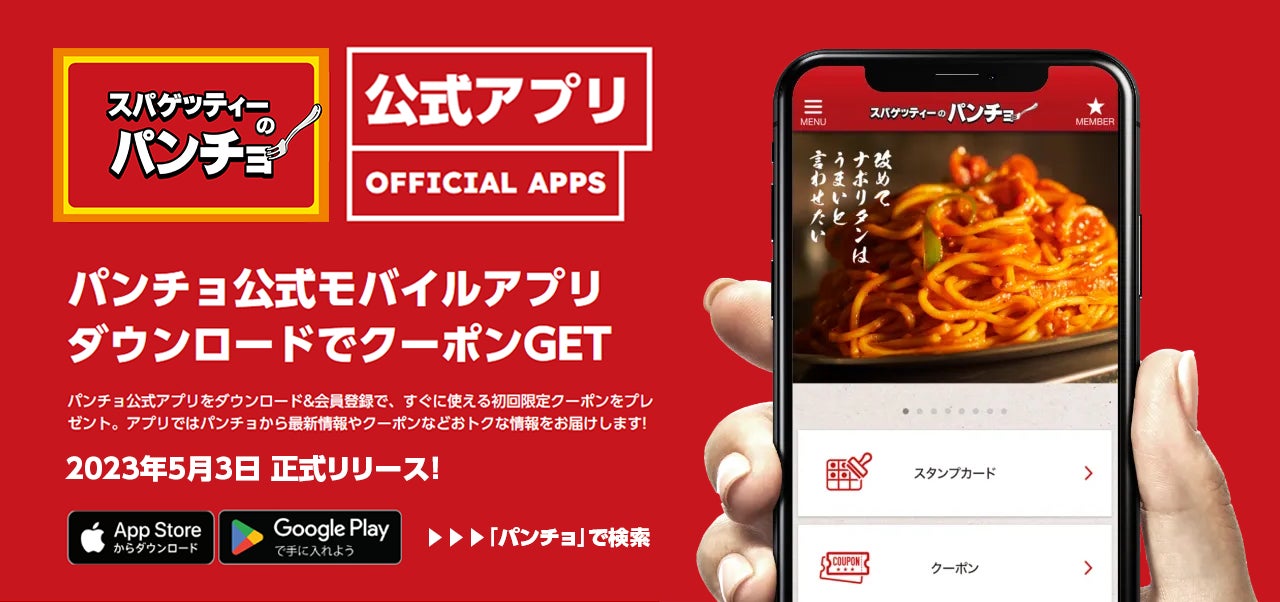 「スパゲッティーのパンチョ」の公式モバイルアプリを2023年5月3日に正式リリースしました。アプリを通して「いつでも」「便利に」「身近に」これまでに増して、パンチョをぜひご愛顧ください。