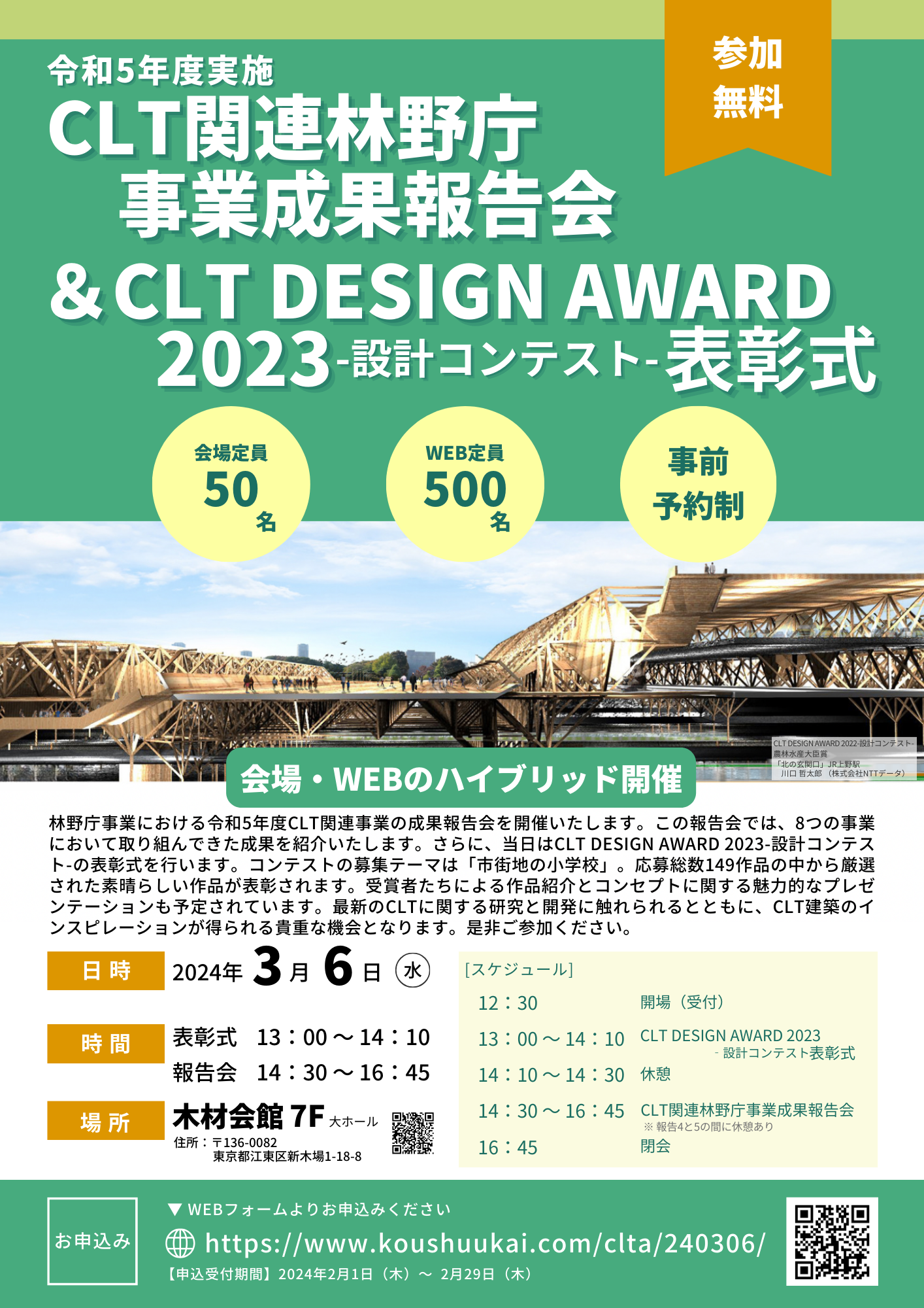 このイベントは、最新のCLTに関する研究と開発の動向に触れつつ、CLT建築のインスピレーションを得る絶好の機会となります。開催は、会場とWEB配信のハイブリッド形式で行われます。ぜひ皆様のご参加をお待ちしております。