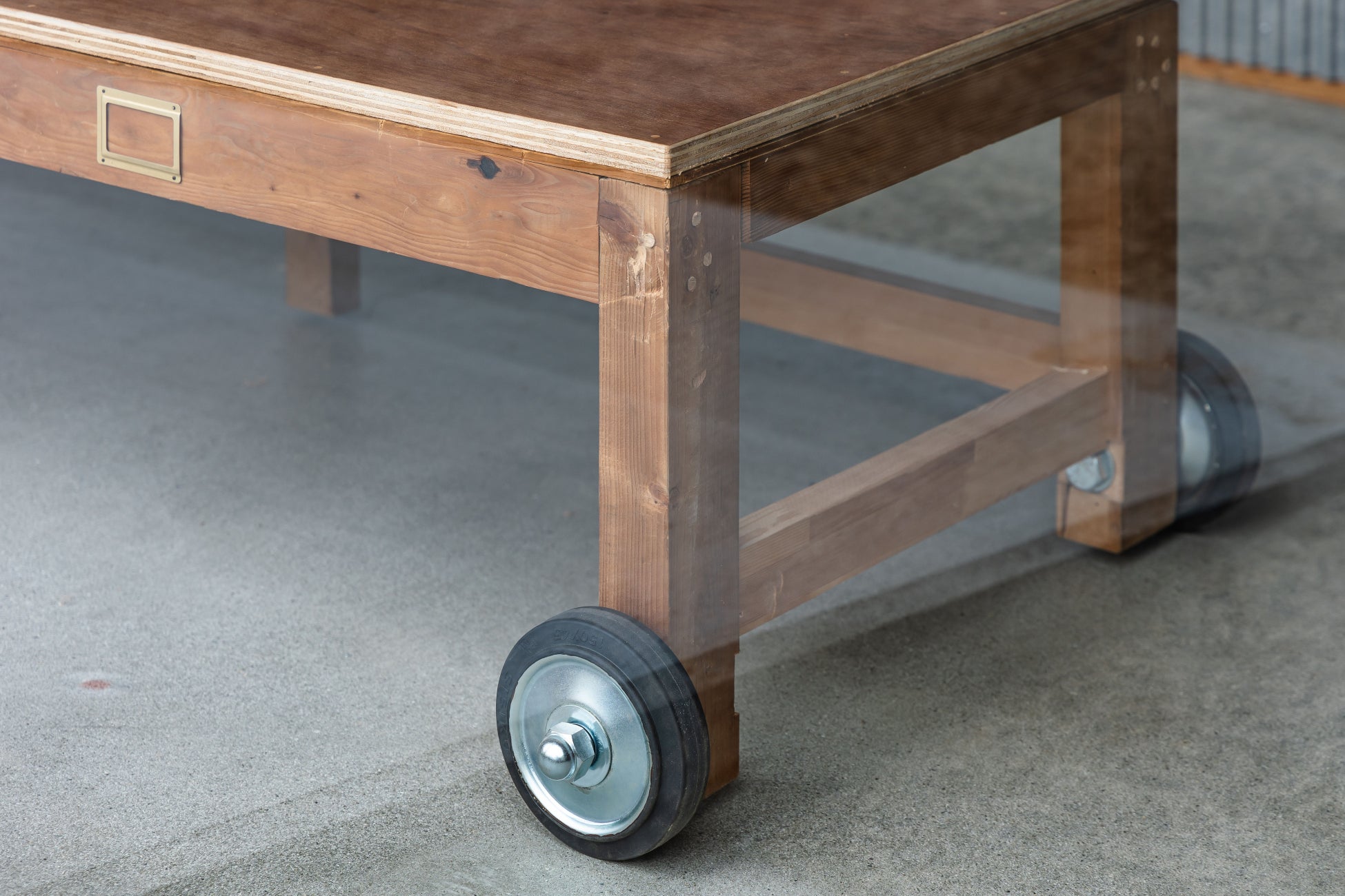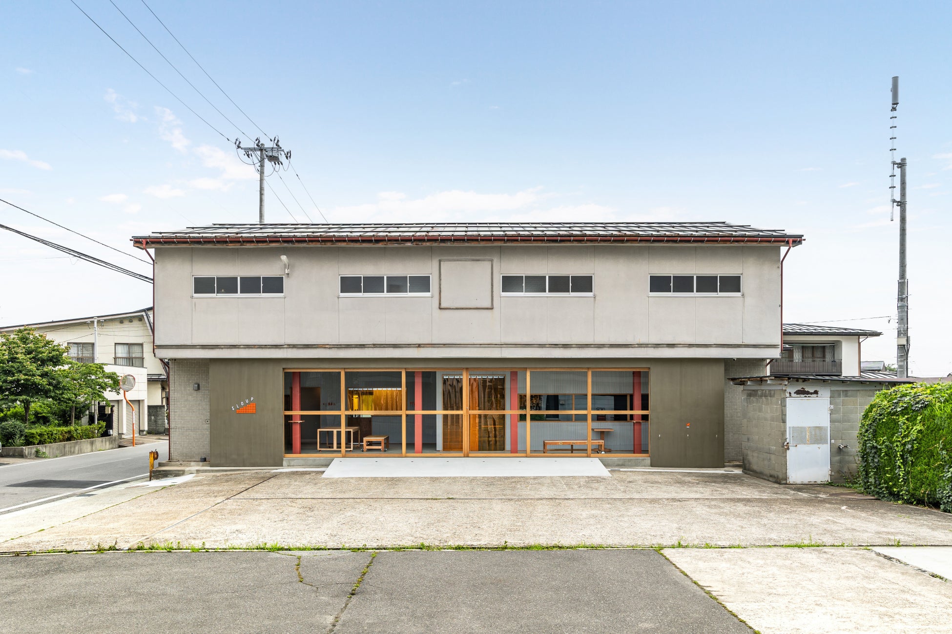 土間はテイクアウトを注文した人の待機スペース、物販、イベントなど、様々なシーンでの利用が考えられるため、用途に合わせて家具の配置を簡単に変えられる設計。糸の収納棚を再活用した家具には車輪をつけ、ひとりでも移動可能。また駐車場に面する店の入口は全面ガラスの引き戸。全面開放すると土間と屋外がつながり、より開放的な空間に変化する。用途や、天候、季節に応じて、柔軟に姿形を変える。