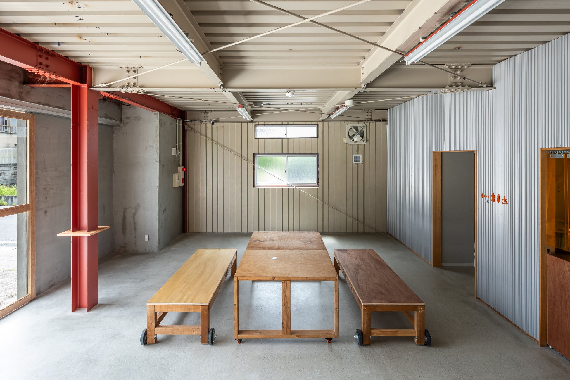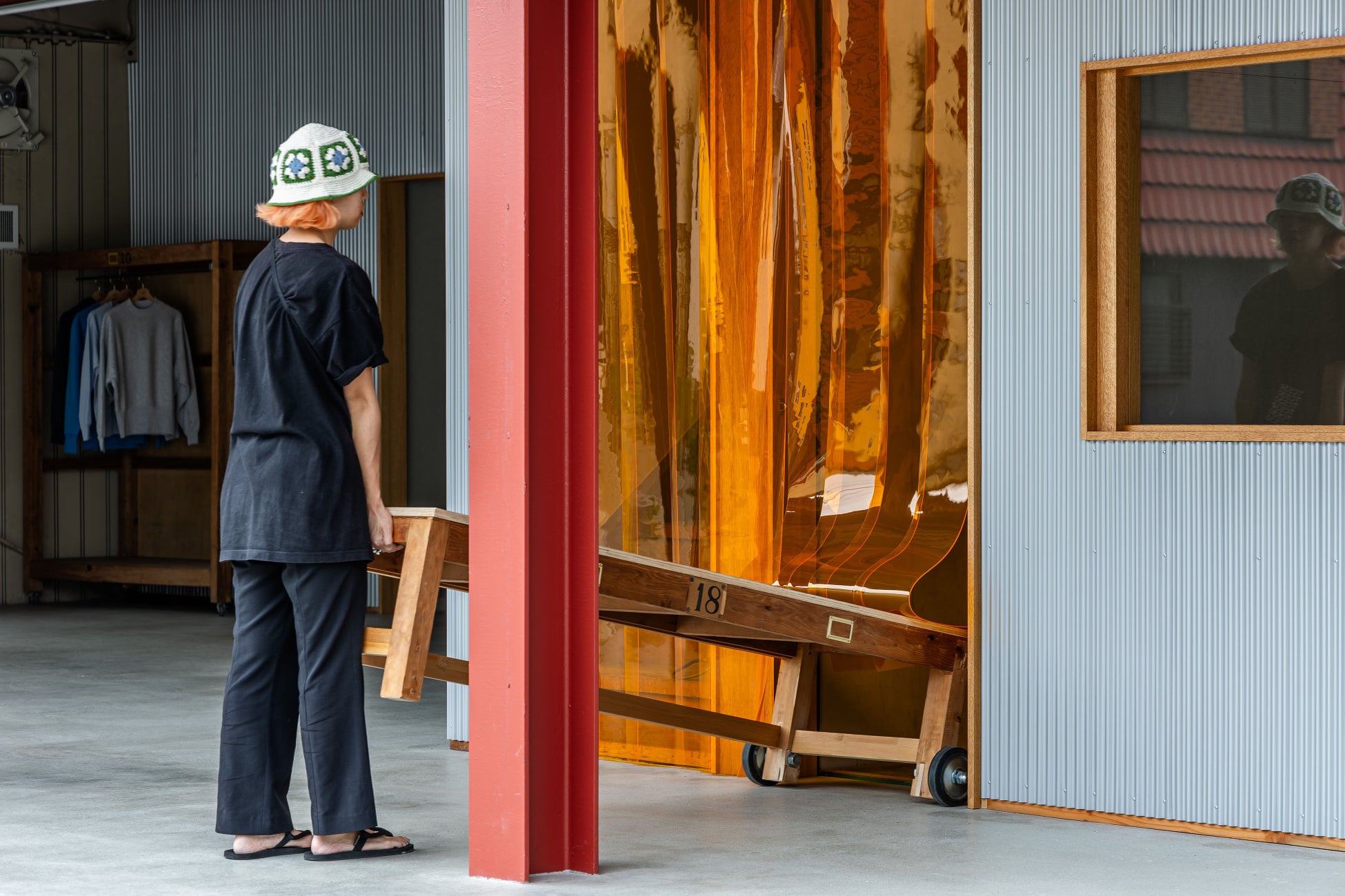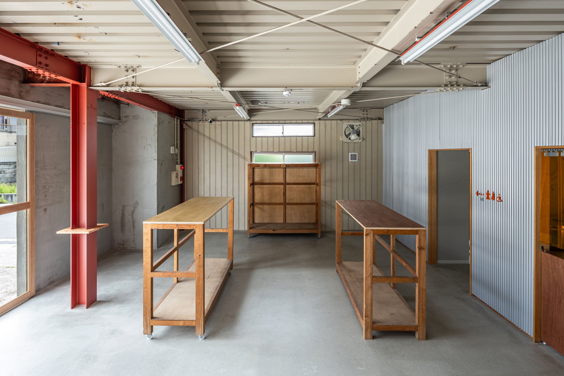 元々糸の卸売業を営んでいた背景から、糸を保管するための約30坪の倉庫を保有しており、その倉庫を改装する形でオープンした。鉄骨の柱をあえて剥き出しに残すなど、元の建築を生かした店舗は、倉庫としての頑強さと包容力を感じられる空間となっている。倉庫内で使われなくなった糸の収納棚も、パーツごとに解体し、テーブルやベンチ、物販用の棚や平台として再活用。新築や新品ではなく、倉庫として使われてきた建物の記憶を引き継ぎながら新しくオープンする。