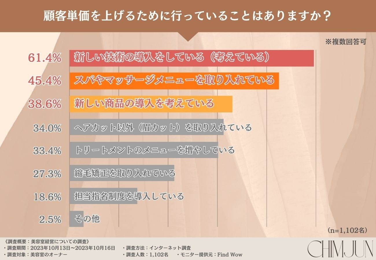 続いて『ヘアカット以外(眉カットなど)を取り入れている(34.0%)』『トリートメントのメニューを増やしている(33.4%)』『縮毛矯正を取り入れている(27.3%)』などのプラスアルファのメニューや、単価の高いメニューの導入も顧客単価を上げるために行なっている方がいらっしゃいました。