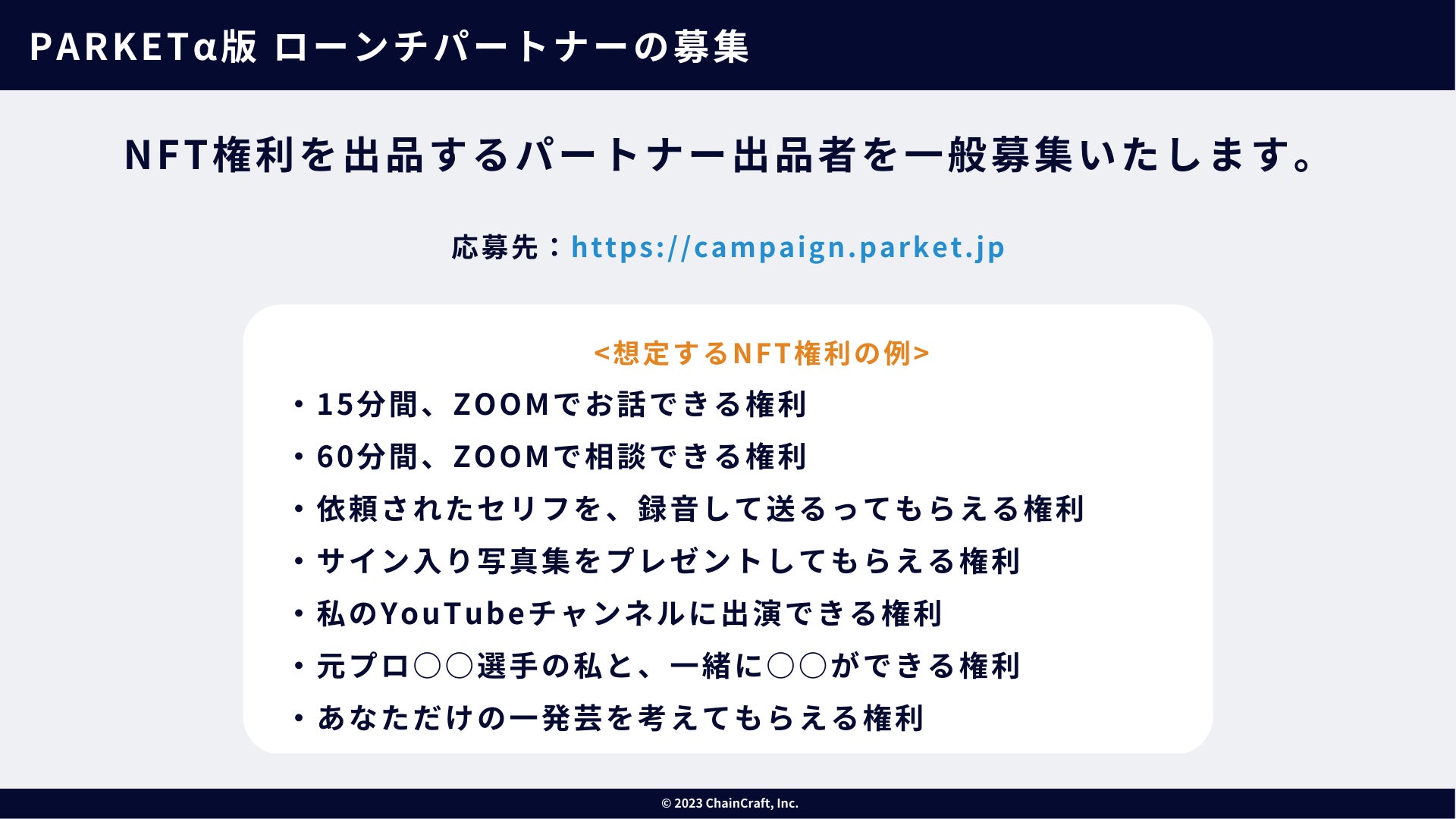 株式会社ChainCraft(東京都港区、代表:山﨑朋征)は、NFT権利発行プラットフォーム「PARKET」のα版のローンチをお知らせするとともに、出品者の募集を開始します。PARKETでは「私と30分間相談できる権利」や「私に歌をつくってもらえる権利」など、その人ならではできることを“NFT権利”として誰でも簡単に発行・流通させることができます。パートナー出品者募集特設サイト:https://campaign.parket.jp/