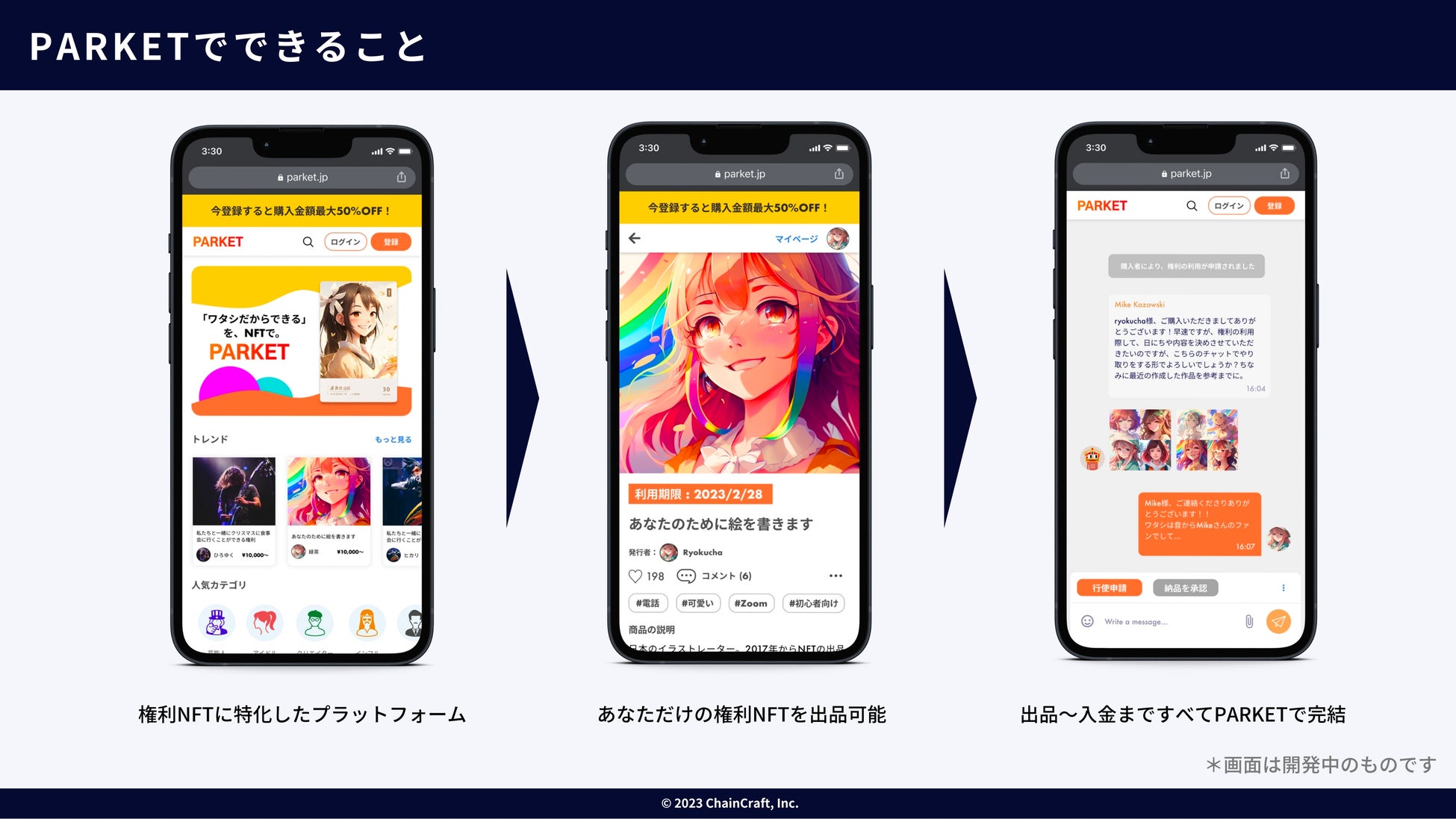 ChainCraftはそのような理念から、PARKETのようにWeb3の特徴を活かしつつ、幅広い個人にWeb3を使っていただけるプロダクトを開発したいと考えています。安心して使えるよう、セキュリティ面の対策や、弁護士監修のもと法律面には最大限の配慮をしています。PARKETが多くの人にWeb3の世界の可能性を伝えられる入り口となればと思います。