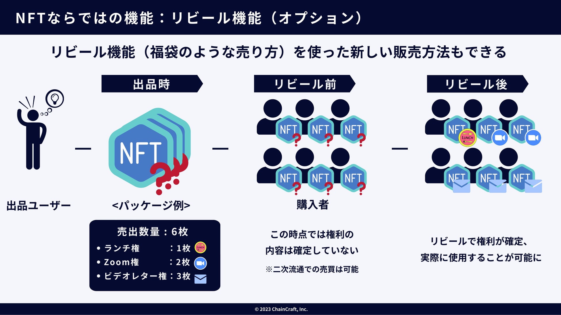 NFTならではの新しい手法も存在します。福袋形式で購入後に中身がわかる"リビール"という販売方法と、NFT購入者限定特典等としてプラスアルファの体験を提供できる"エアドロップ"です。これらの手法により、購入者に対して新しい体験を提供することが可能です。