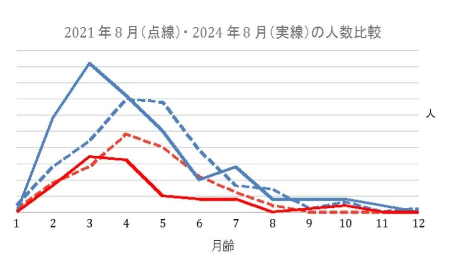 お陰さまで当クリニックも2021年3月の開院以来3年半が経ちました。この間、1万人のお子さまの診療に携わり、多くの悩みを抱えたご家族と一緒に赤ちゃんの頭のかたちの治療に取り組んでまいりました。下図に受診した赤ちゃんの月齢分布の3年前との比較を示します。
