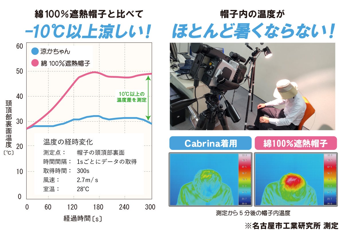 名古屋市工業研究所にて、涼しさの試験を実施したところ、他の遮熱帽子と比較して10℃以上涼しいという結果を取得しました。 ※他社製品との比較試験結果※