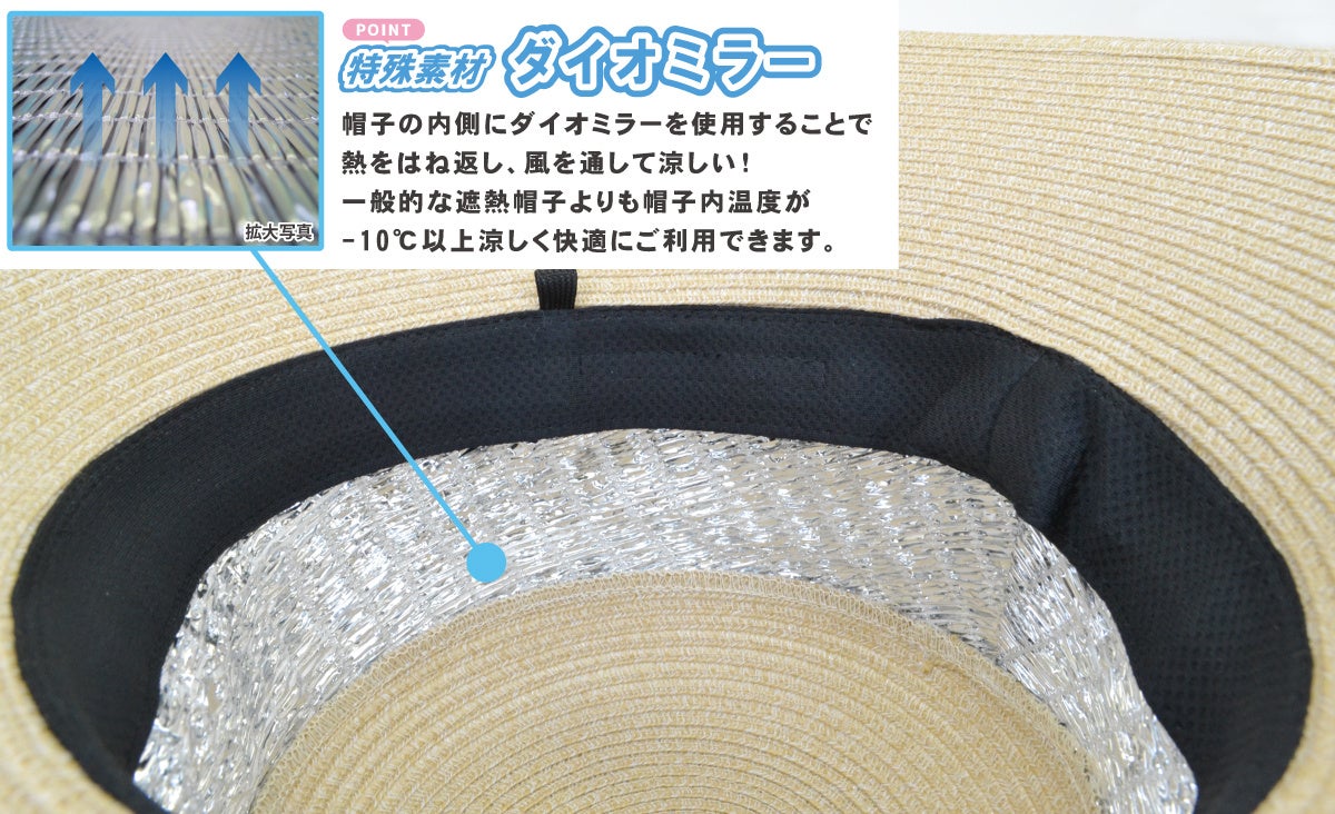 オリジナル素材「ダイオミラー」を帽子側面に使用することで、遮熱性と通気性を同時に実現。