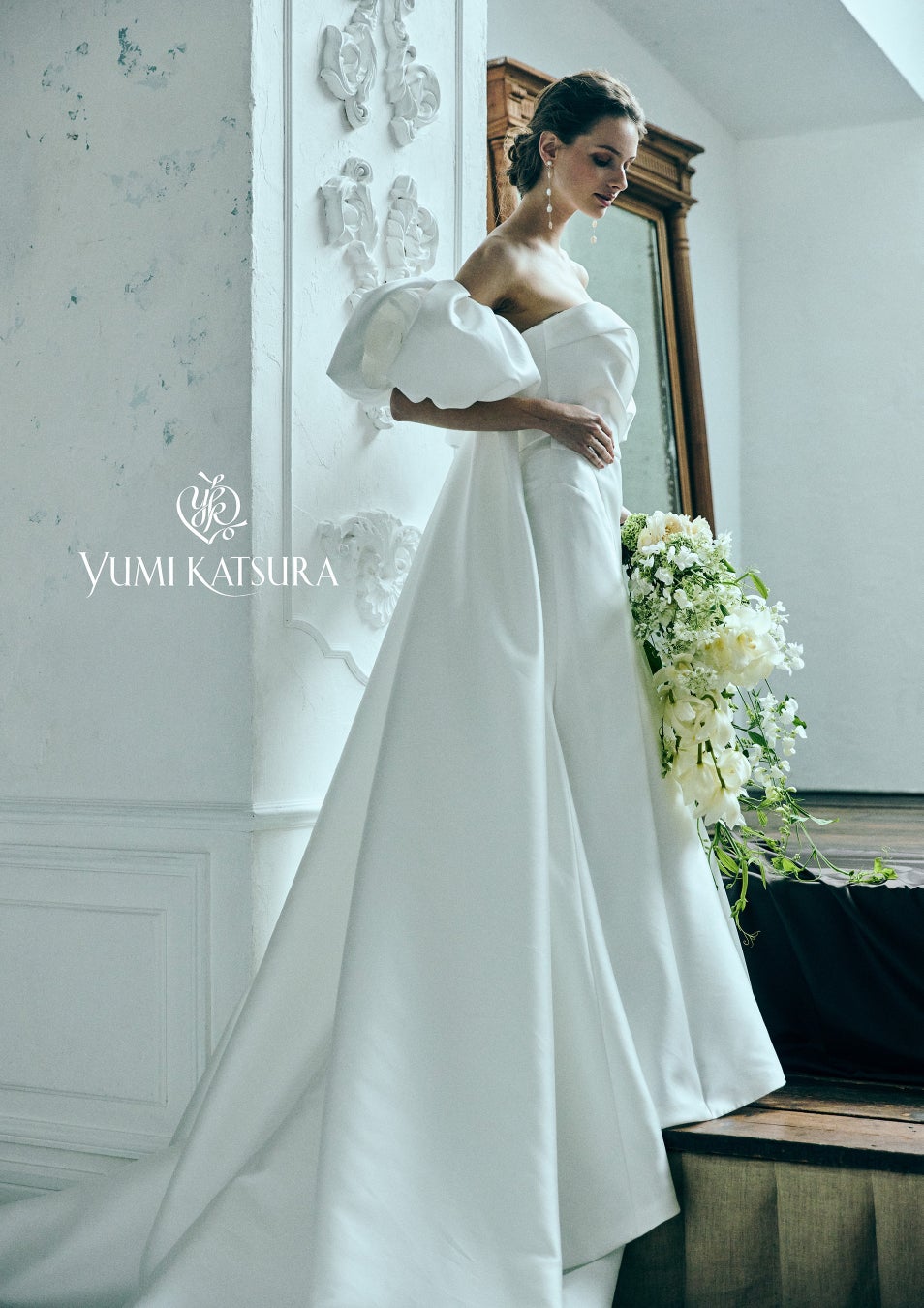 最高級のオートクチュールドレス。内側にバラのコサージュを忍ばせたこだわりのビッグパフが印象的。ミカド素材をたっぷりと使用したモノマテリアルデザイン。レースのオーバースカートを重ねるとさらにスーパーロングトレーンに。フォトジェニックなバックスタイルを挙式では演出。披露宴会場ではシンプルなドレスにガラリとイメージが変わるのが最大の魅力。