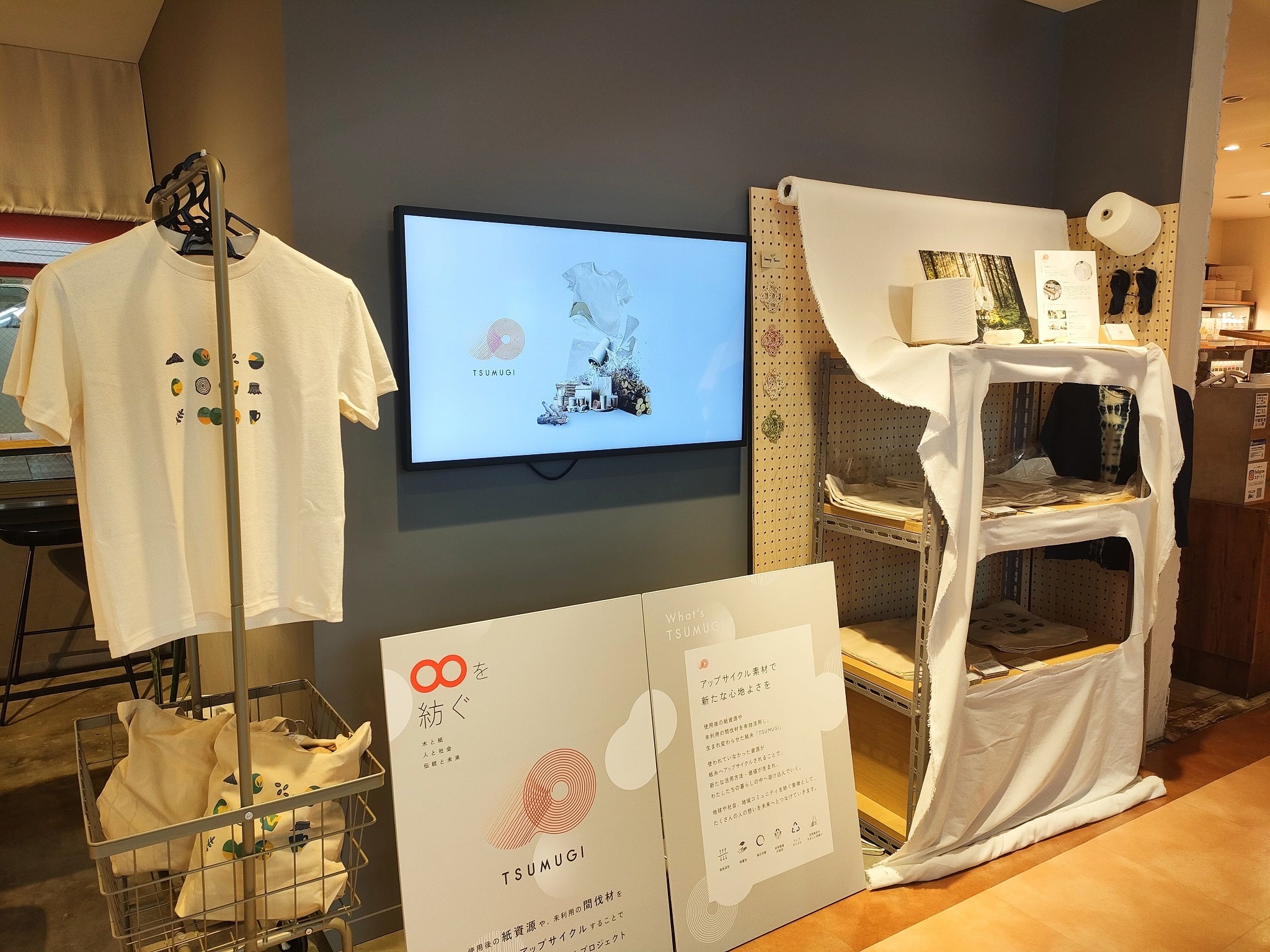 プロジェクト「TSUMUGI」は、使用後の紙資源や未利用の間伐材を紙糸に生まれ変わらせる取り組みです。紙糸は、天然繊維ならではの柔らかさと、軽量性、吸放湿性が特徴で、まるで自然の中にいるようなやさしい肌触りを感じることができます。これまで、ECサイトと後楽園のカフェ「クラフト & テロワージュ」にて、この紙糸を使用したオリジナルTシャツやトートバッグを販売してまいりました。しっかりとした縫製で、みなさまに長く愛用してもらえるようMade in Japanならではの技術が詰まっています。「TSUMUGI」という名前には、わたしたちと地球や社会・地域コミュニティを紡ぐ象徴として手に取っていただきたいという想いが込められています。
