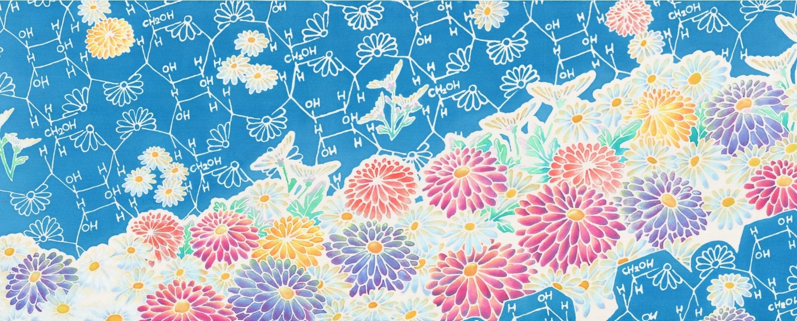 テーマ:廃棄される紙資源や間伐材を活用し、制作される紙糸が主成分「セルロース」を軸に輪廻しているように感じた。そこから「輪廻」をテーマとし、友禅のモチーフによく用いられ、「輪廻転生、再生」の花言葉を持つキク科の植物をデザインに取り入れた。
