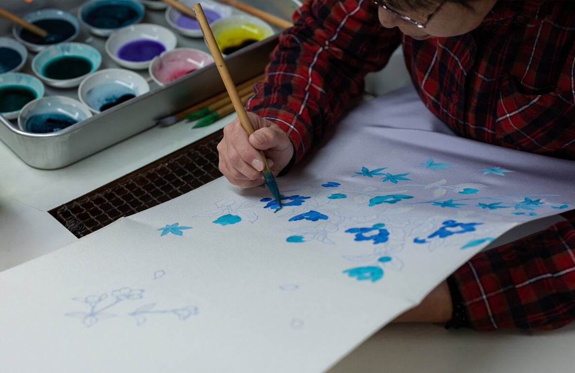加賀友禅の歴史は約500年前、現在の石川県・金沢独自の染色技法「梅染」にさかのぼります。17世紀中頃には加賀御国染と呼ばれる繊細な模様染が確立。江戸元禄時代に京都で人気を博した扇絵師「宮崎友禅斎」のデザインと融合し加賀友禅の基礎が出来上がりました。最盛期には350人を超える作家がいましたが、現在は後継者不足など、縮小の一途にあり、これまで培われてきた守るべき技術を次世代に継承していくことは喫緊の課題でもあります。