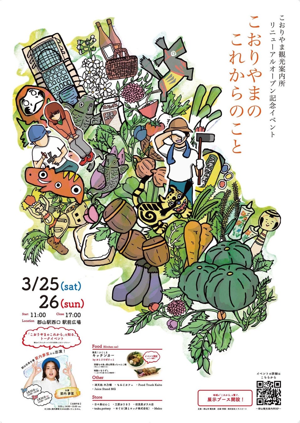 「こおりやま観光案内所(JR東日本 郡山駅2階)」のリニューアルオープンに併せて、女優の箭内 夢菜さんをはじめとした「“こおりやま”のこれからを創造する若手チャレンジャー」によるトークショーなどの記念イベントや福島県内の食やモノが集まるブース出展を行います。