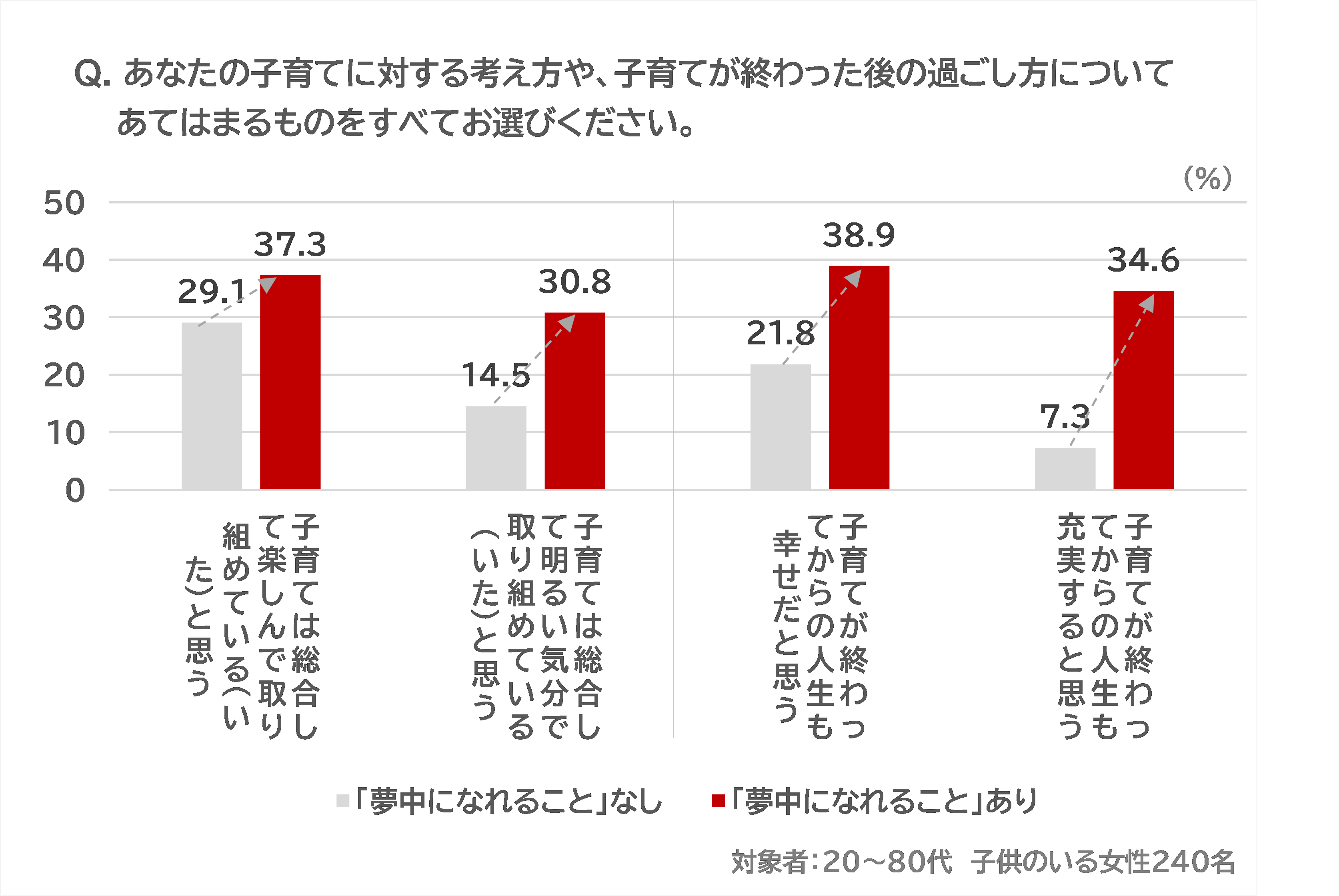 また、子育て後の過ごし方についても聞いたところ、「終わってからの人生も充実すると思う」と考えているのは、夢中になれることがある人が34.6%で、7.3%のない人と比較すると約4.7倍高い結果となりました。