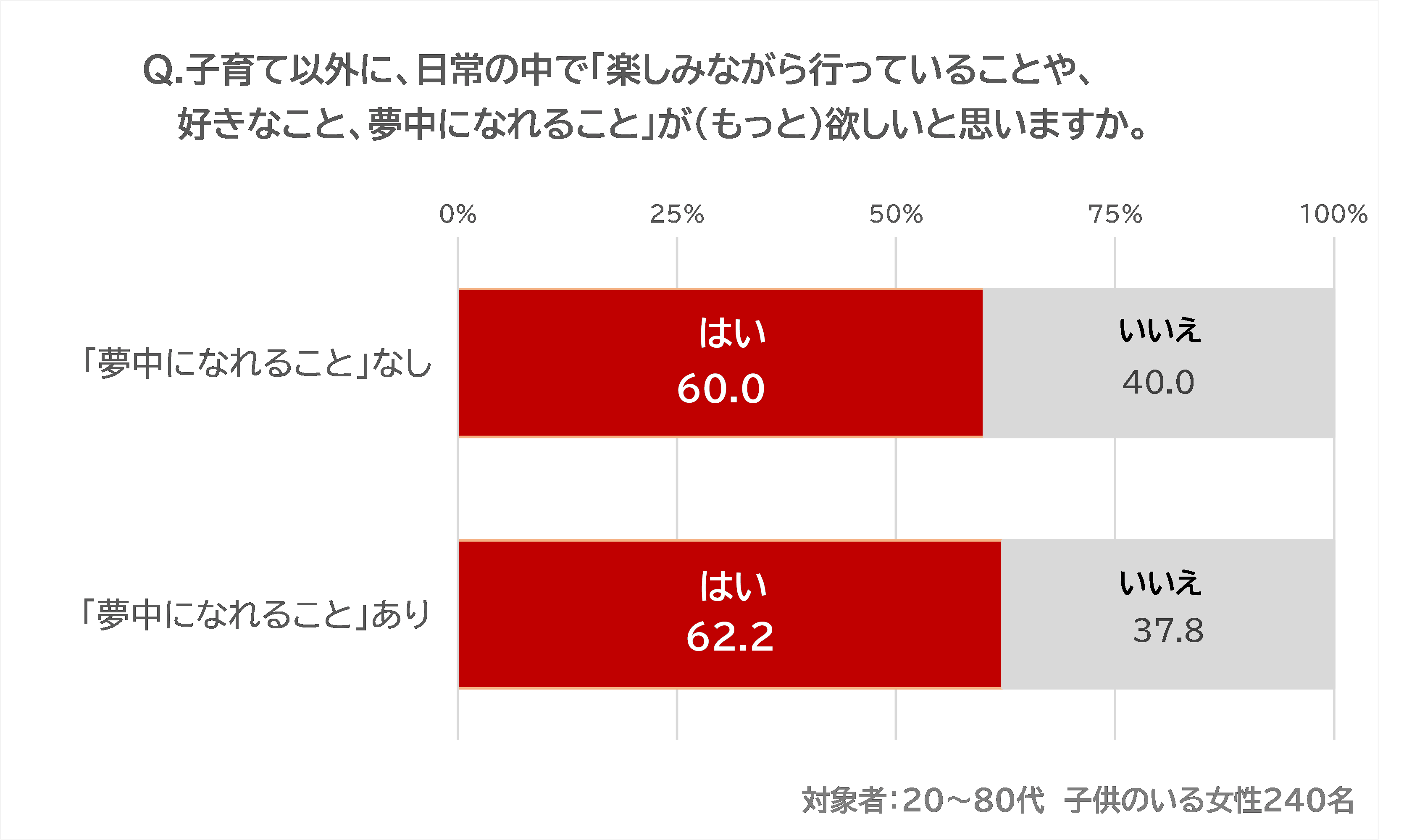 「Q2. 子育て以外に、日常の中で『楽しみながら行っていることや、好きなこと、夢中になれること』が(もっと)欲しいと思いますか」(n=240)と質問し、Q1の夢中になれることの有無別に比較したところ、「はい」と回答したのは、夢中になれることがある母親は62.2%、ない母親は60.0%で、どちらもさらに楽しみがほしいという結果となりました。