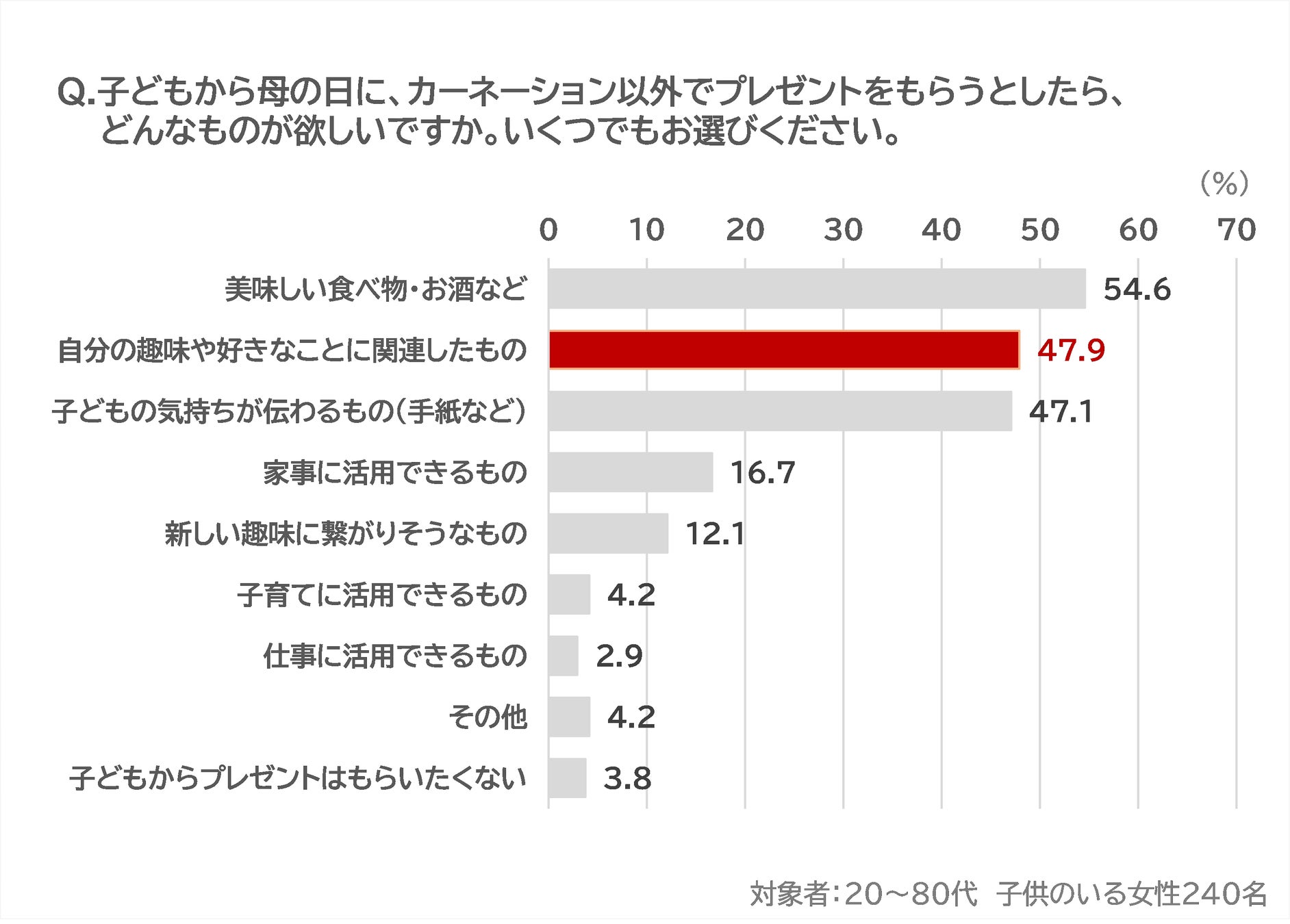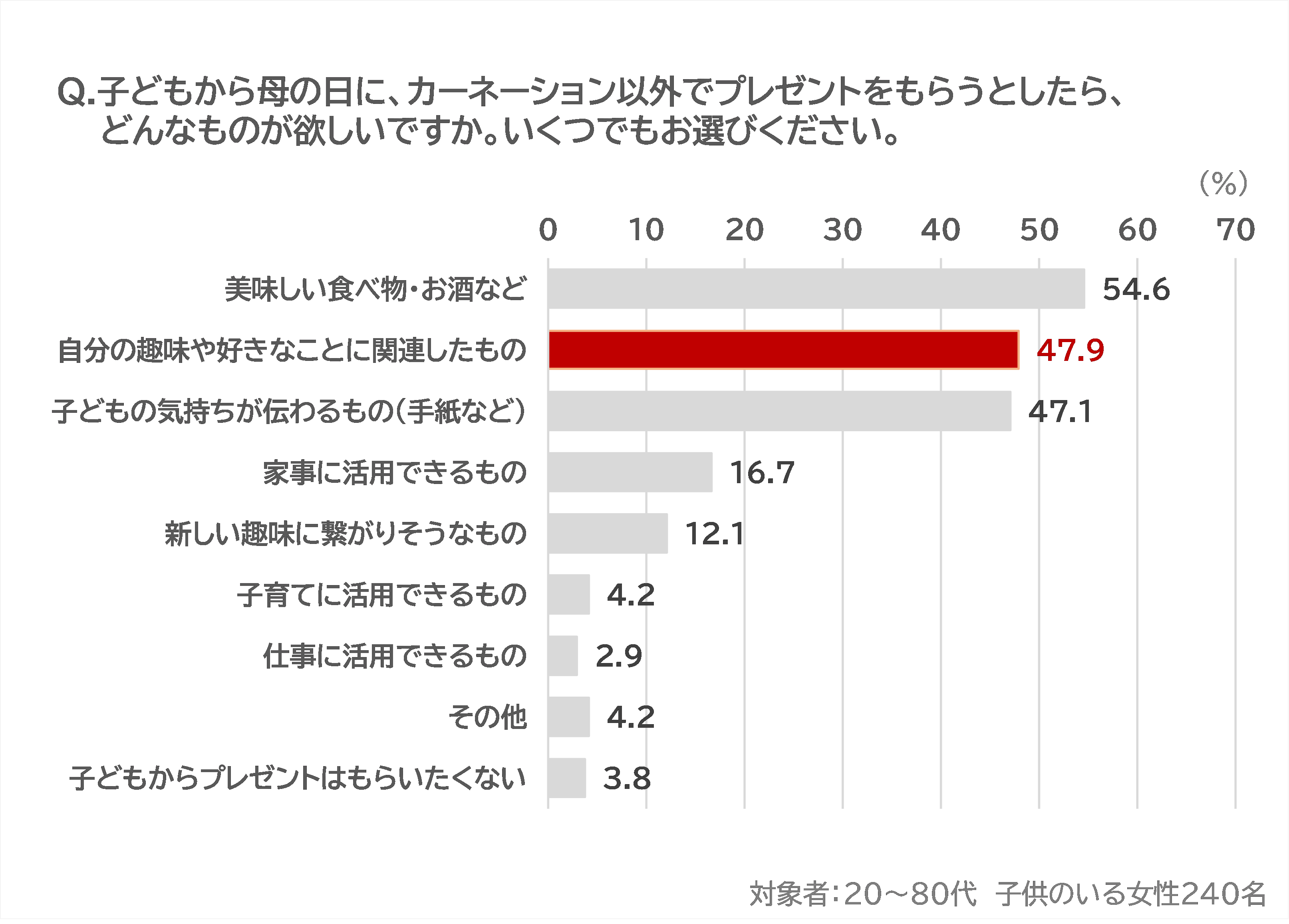 「Q5. 子どもから母の日にカーネーション以外でプレゼントをもらうとしたら、どんなものが欲しいですか」(n=240)と質問したところ、「美味しい食べ物・お酒など」(54.6%)が最多で、「自分の趣味や好きなことに関連したもの」(47.9%)、「子どもの気持ちが伝わるもの(手紙など)」と続き、自分の関心があるものや趣味にまつわるものが選ばれる傾向にありました。