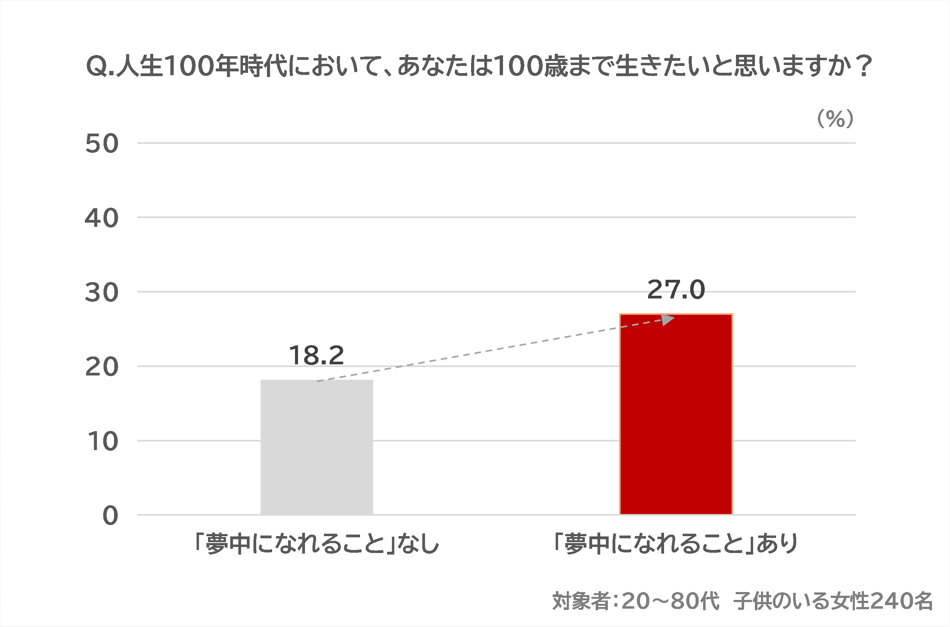 「Q3. 人生100年時代において、あなたは100歳まで生きたいと思いますか?」(n=240)と質問したところ、夢中になれることがある母親の27.0%が「そう思う」と回答しました。夢中になれることがない母親の18.2%と比べ、約1.5倍高い結果となりました。