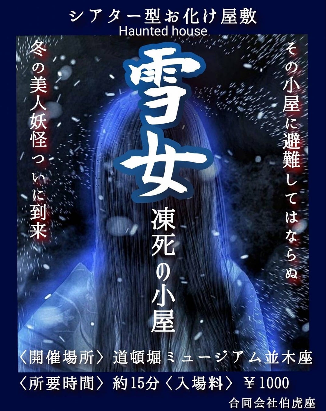 エンターテイメントの街、関西を拠点に全国各地にお化け屋敷、ホラーイベントをプロデュースする『関西ホラーエンターテイメント集団 合同会社伯虎座』(以下 合同会社伯虎座)は、2023年3月11日(土)、3月21日(火祝)の二日間、大阪道頓堀ミュージアム並木座にてシアター型お化け屋敷『雪女~凍死の小屋~』(https://hakutoraza.themedia.jp/pages/4509527/page_202101031918)を期間限定開催する。