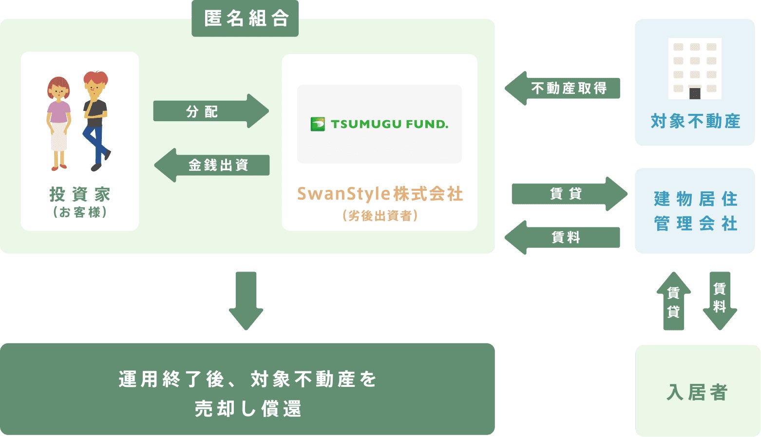 優先劣後システムを採用し、投資家の皆さまの出資を「優先出資」とし、当社からの出資は 「劣後出資」としています。これにより、投資家の皆さまが優先して、出資金の返還を受けることができます。例えば、劣後出資が20%だった場合、不動産価格の下落が20%までであれば、その損失は当社が負担し、投資家の皆さまの出資元本はその影響を受けずに満額返還されます。