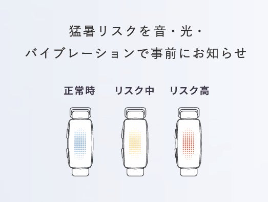 時計のように腕に装着するだけで使用可能。3段階のLED表示と振動でリスクを通知するため、高齢者やお子様にもわかりやすく安心です。 また、通信不要のため、ネットワーク環境がない現場でも使用可能です。