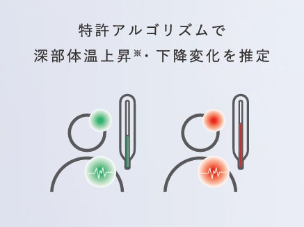 本製品には、学校法人産業医科大学およびミツフジ株式会社が共同で保有する特許アルゴ リズムが搭載されており、着用者の脈波から深部体温の変化(上昇・下降)を推定・可視化することが可能です。