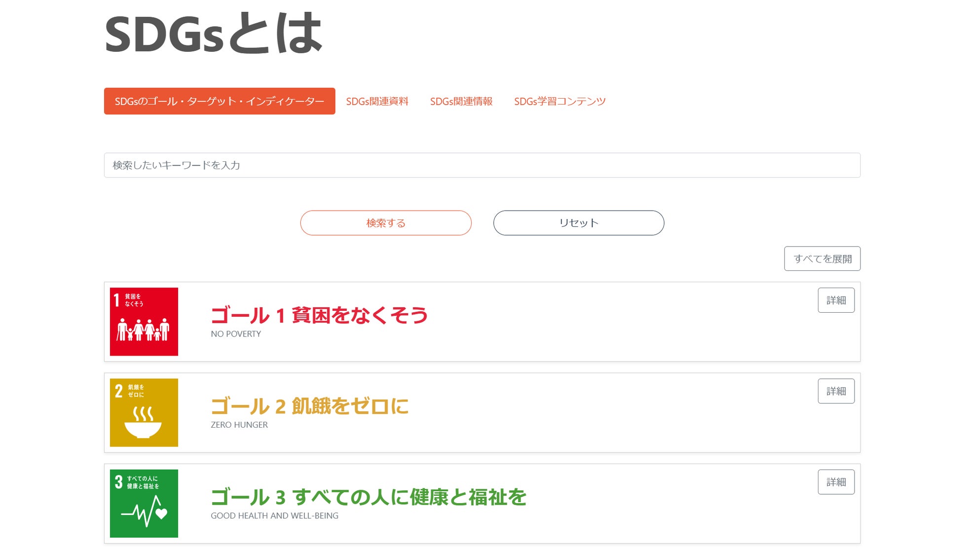 SDGsを構成するゴール、ターゲット、インディケーターや各省庁・団体のSDGs関連資料・情報といったSDGsに関する基本情報の検索が可能です。また、SDGsへの理解を促進し、行動を誘発する学習ツールであるSDGsスタディパネルのダウンロードも可能です。