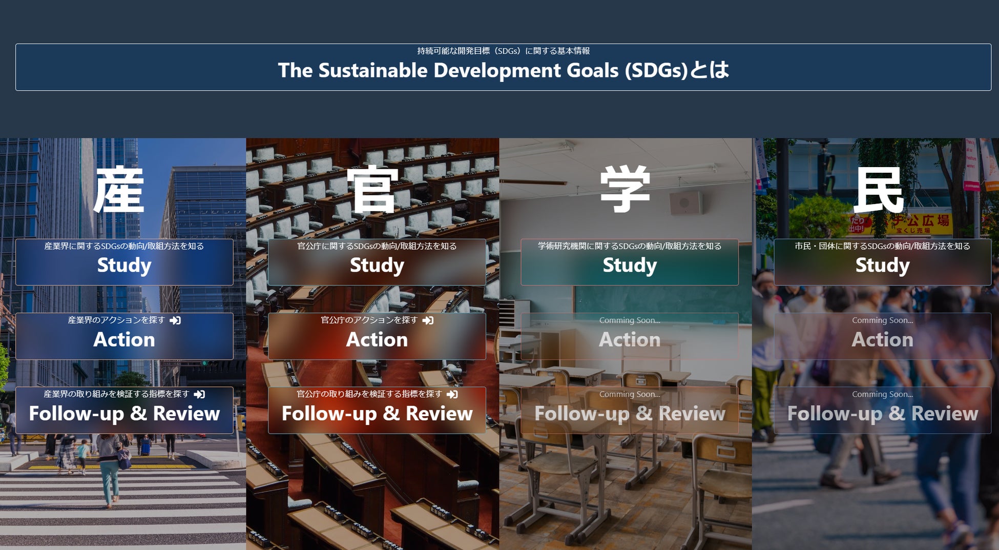一部のセクター(学・民)の情報については現在公開に向けて整理を行っています。今後整備が完了した段階で順次公開していく予定です。また、データの更新も随時進めてまいります。産官学民の関係者の皆様のSDGs達成に向けた取り組み推進の一助になるよう、今後も継続して情報提供に努めて参ります。